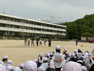4月 22 2026 命を守る訓練 あたらしい学年となって初めての命を守る訓練が行われました。 今回の一番の目的は、避難ルートの確認です。先生の話を聞きながら、『お・は・し・も」のルールを守って避難することができました。 根本につくられた新しい消防署から署長さんを含めて3人の方が来てくださり、お話を聞いたり消火器の使い方を教わったりしました。消防車から放水の様子も見せていただきました。