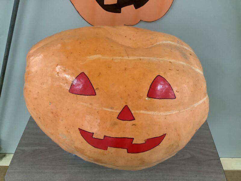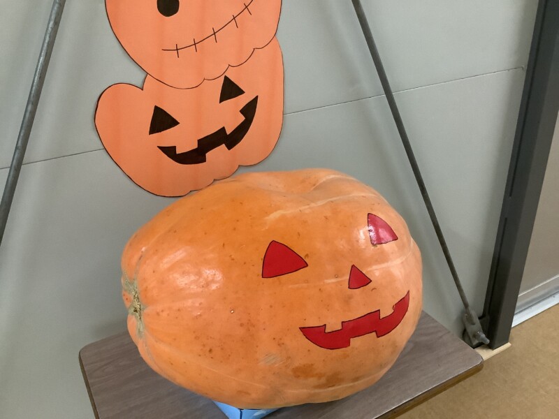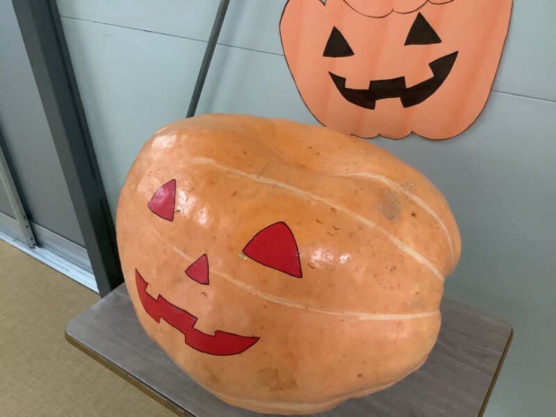 とても大きいカボチャだったため、ハロウインに合わせて、わざわざもってきてくださいました。そこに「ジャック・オー・ランタン」風にテープを貼ったらこんな素晴らしい仕上がりに!