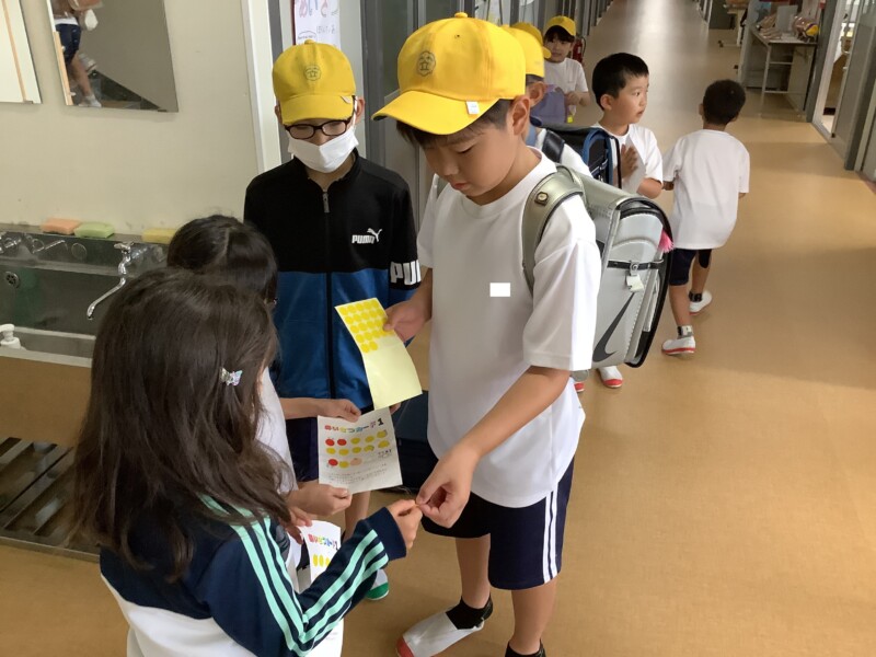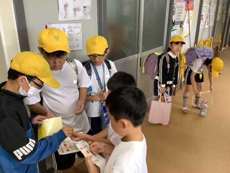 校舎内でもこうして挨拶活動と、参加した人たちへのシール配りが。