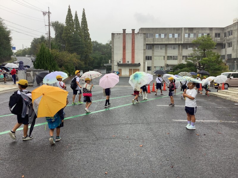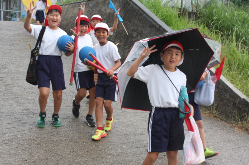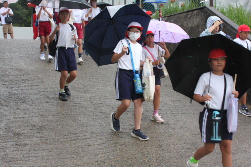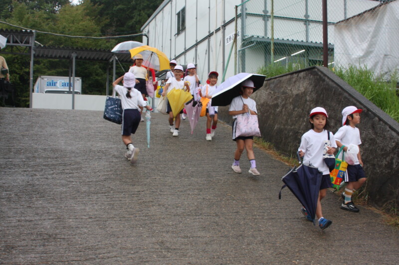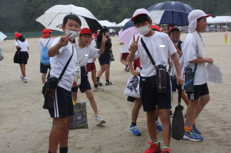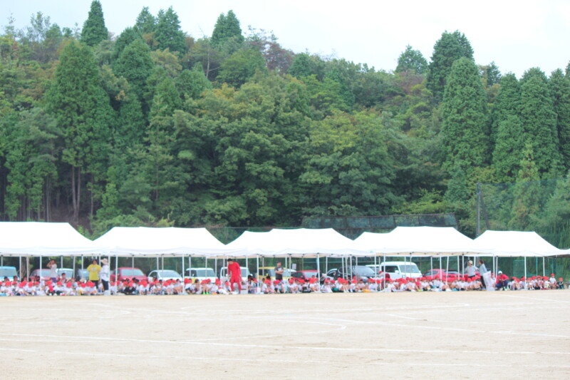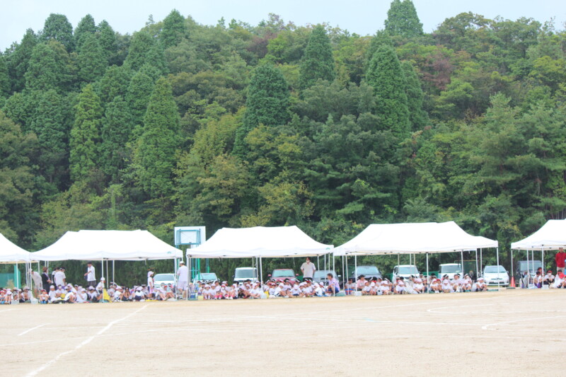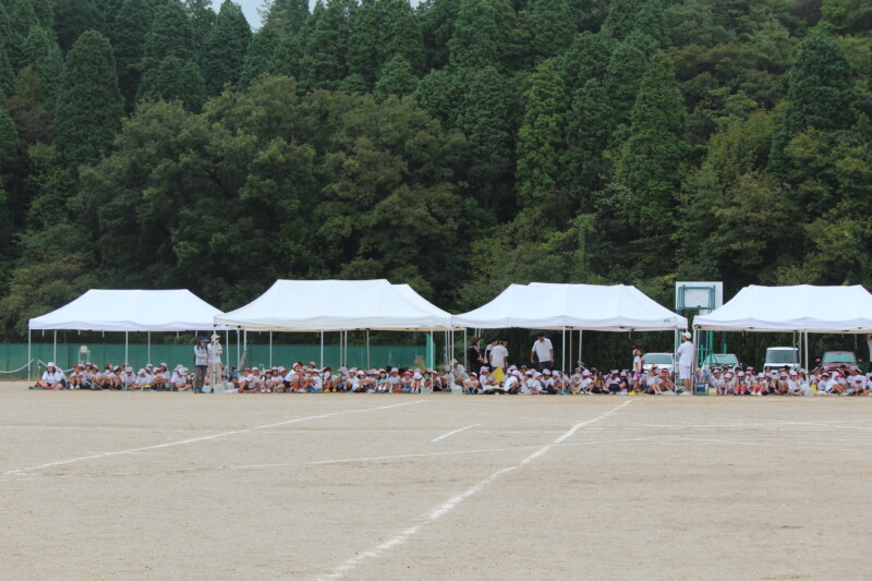こうして全校児童が運動場のテントの下へ。