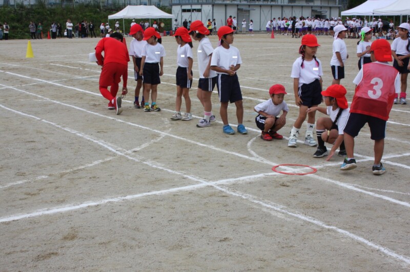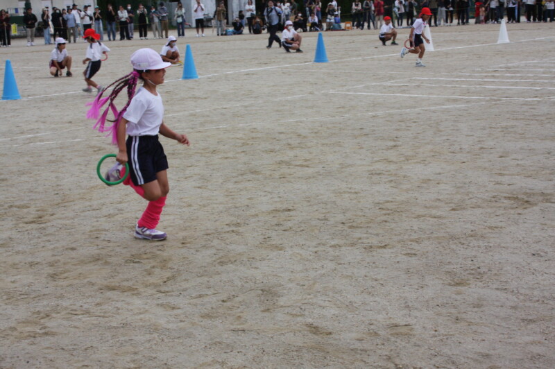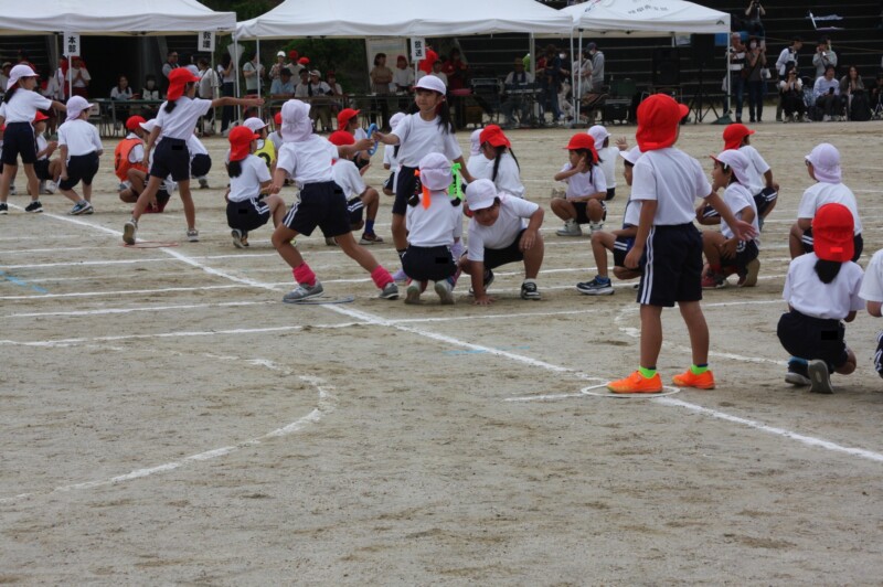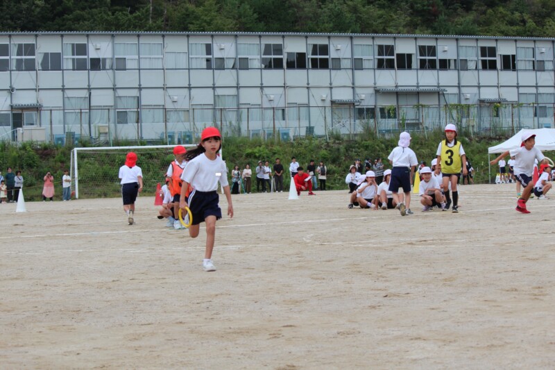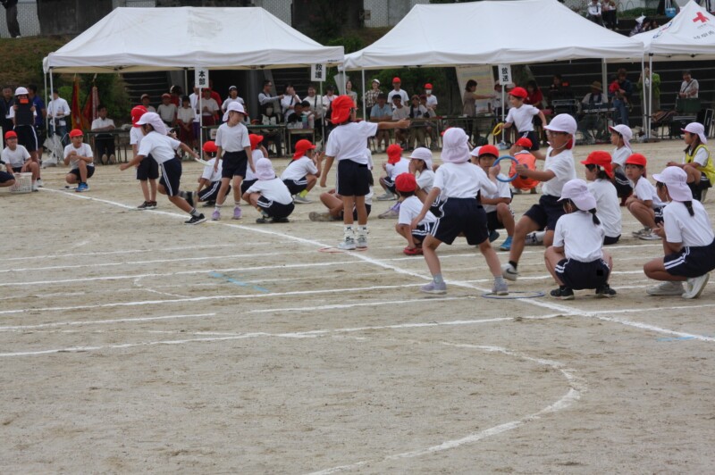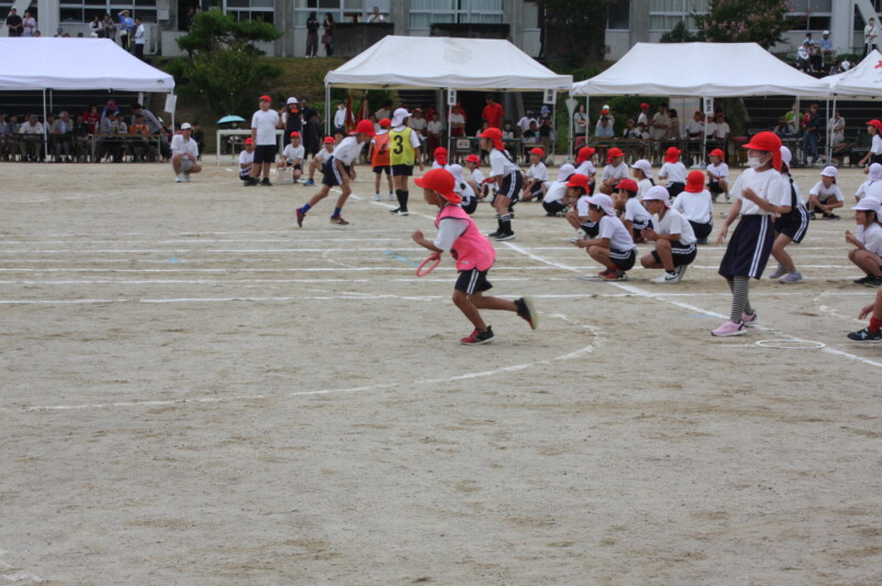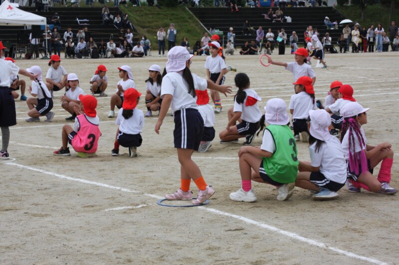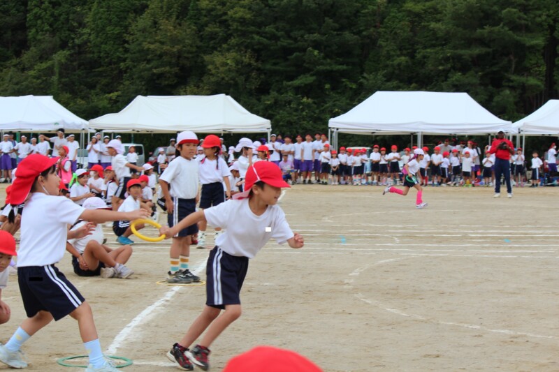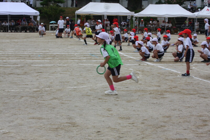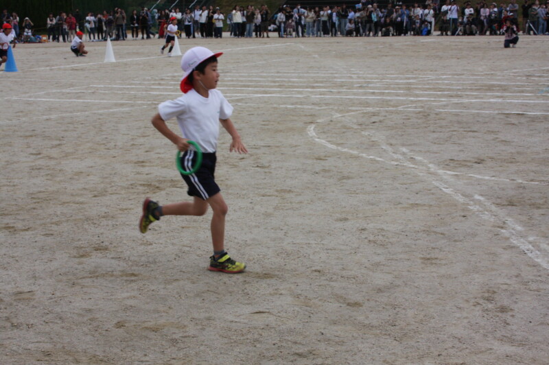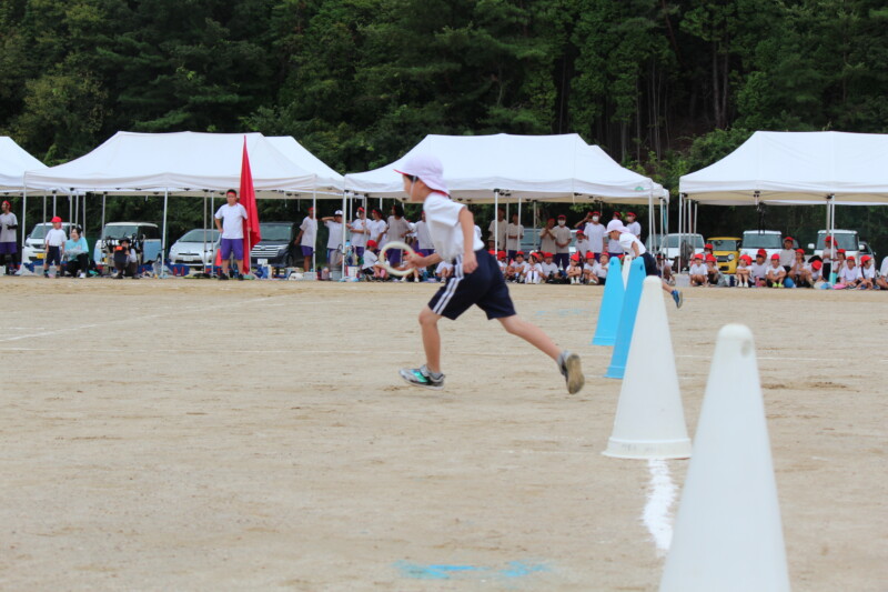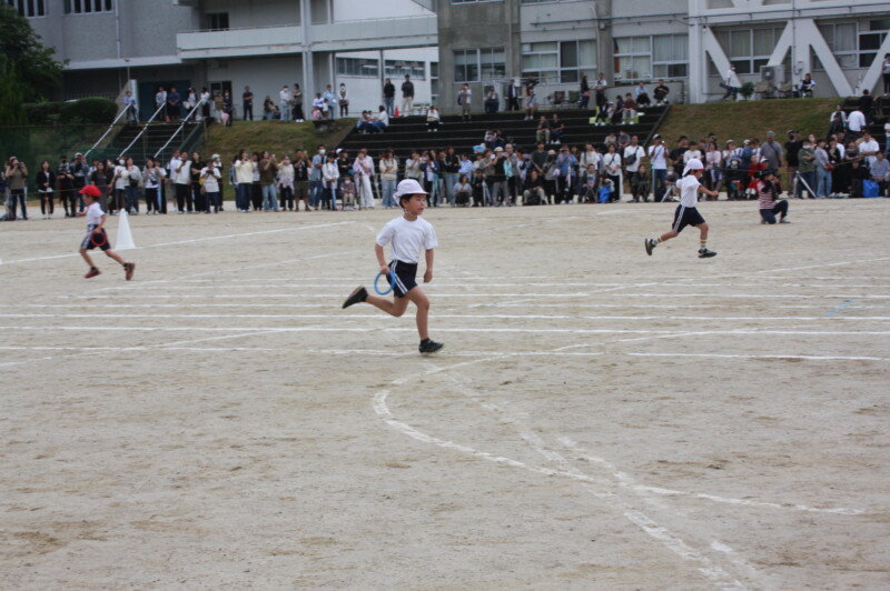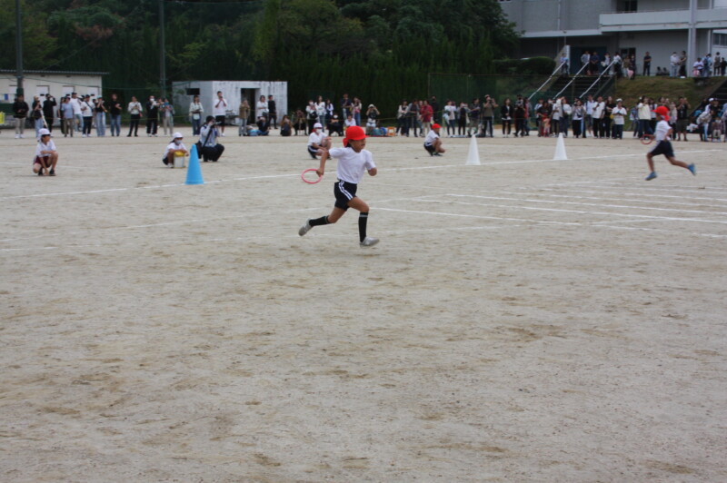 ここからは「スポーツフェスティバル」の特集です。2年生のリレー「Run Run Run」からです。リングをバドン代わりにして、コーンを回ってバトンタッチ。距離はありますが、元気いっぱい、走り切り、バトンを仲間につなぎます。チームの仲間からの声援を間近に聞きながらの競技です。