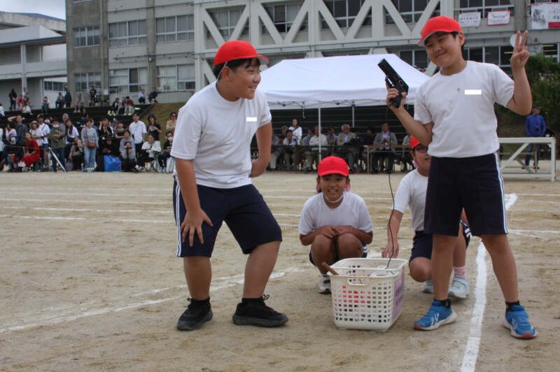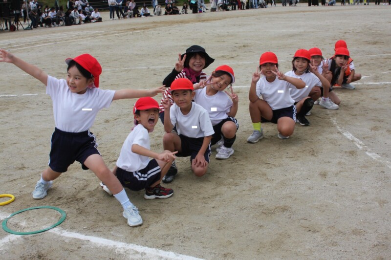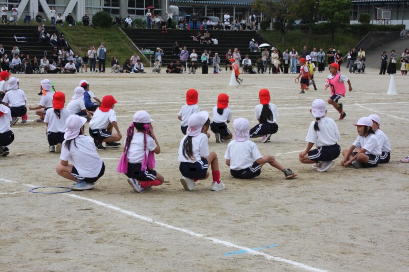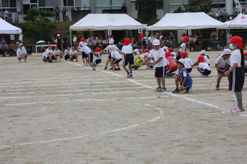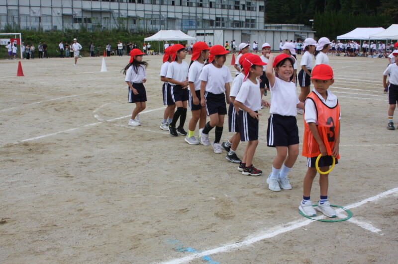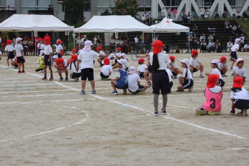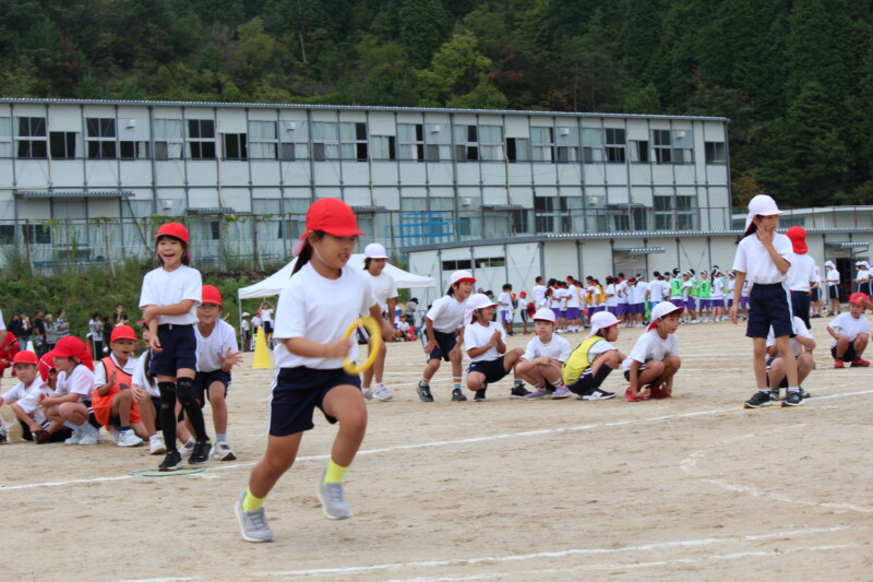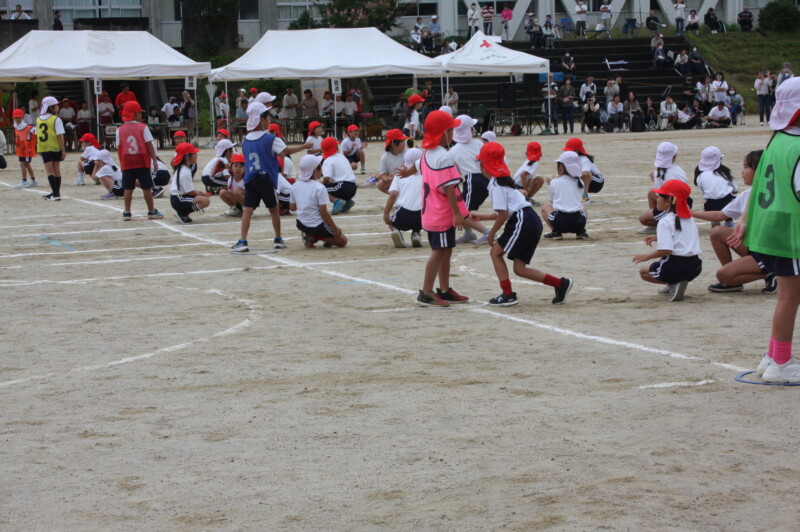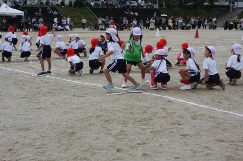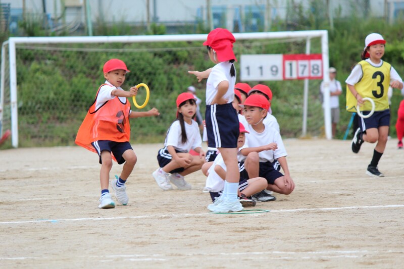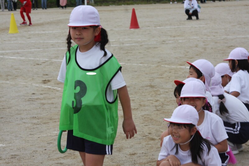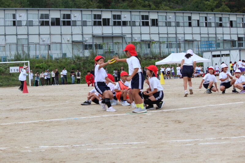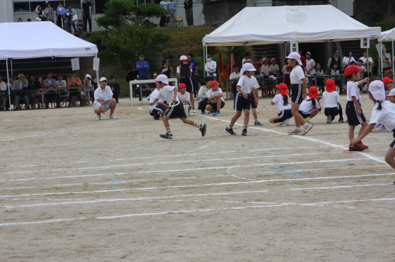 ここからは「スポーツフェスティバル」の特集です。2年生のリレー「Run Run Run」からです。リングをバドン代わりにして、コーンを回ってバトンタッチ。距離はありますが、元気いっぱい、走り切り、バトンを仲間につなぎます。チームの仲間からの声援を間近に聞きながらの競技です。