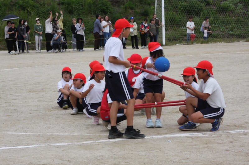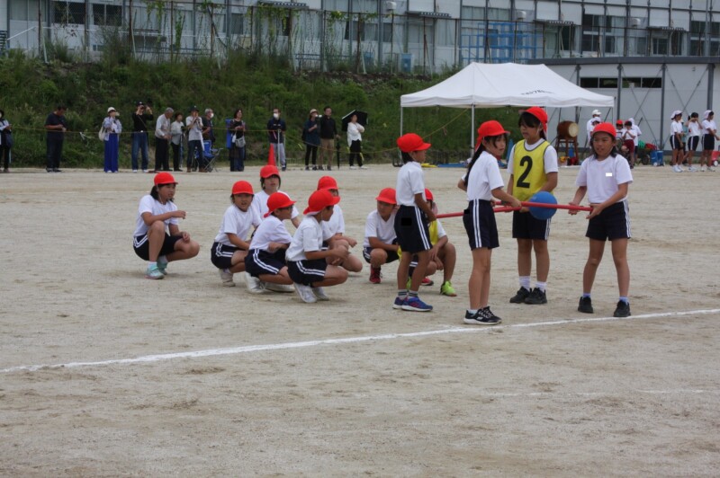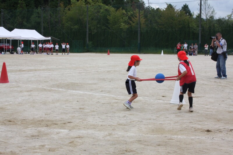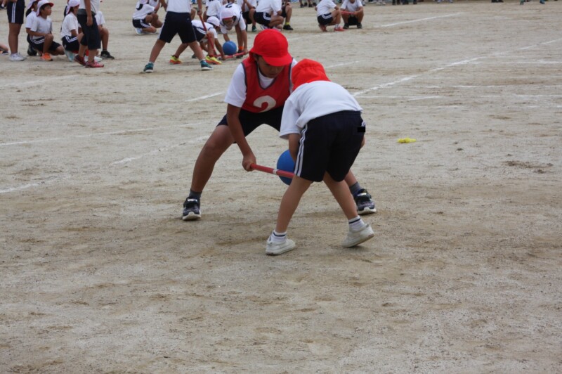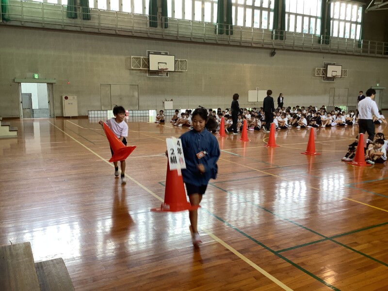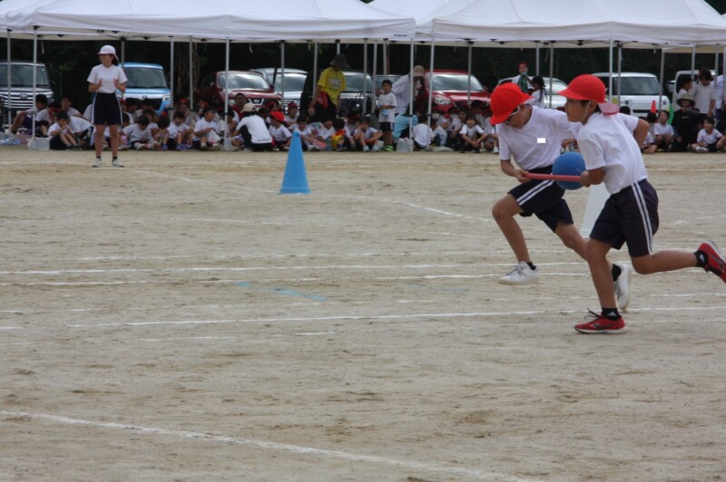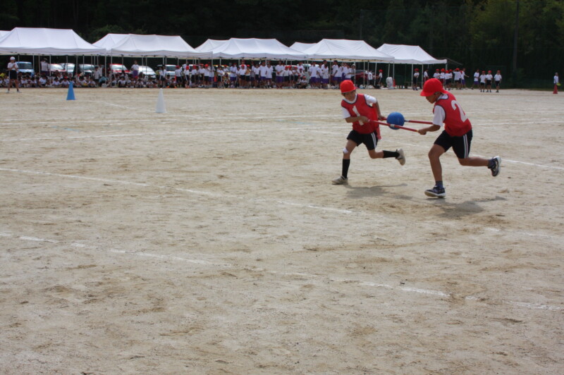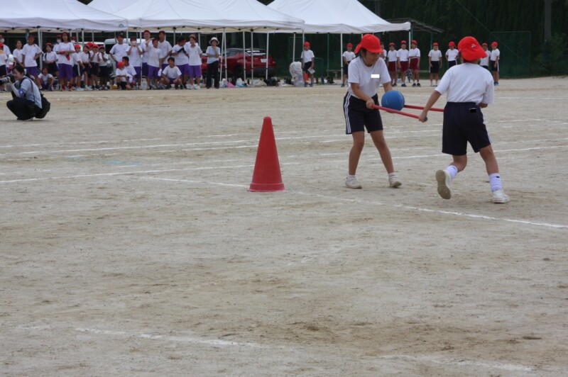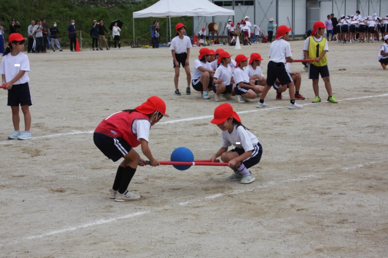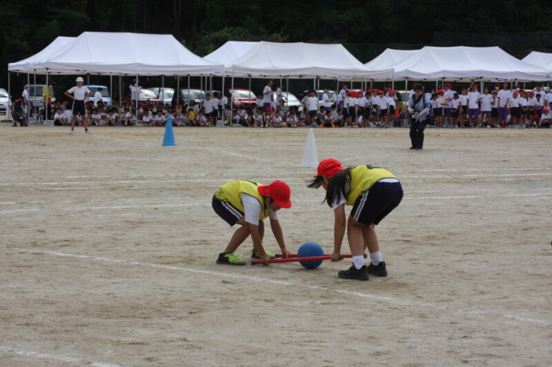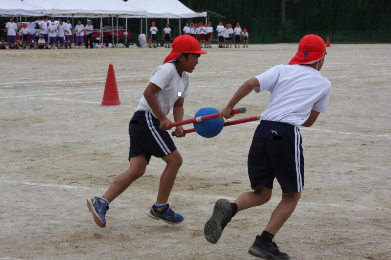 そしてここからは「スポーツフェスティバル」の特集です。4年生の競技「勝利への橋渡し」です。ペアで2本の棒を持ち、その棒の間に上手にボールを挟んで運ぶ競技です。コーンを回るなど、ペアでの連携が必要なので、4年生徒はいえ、競技の難易度は高いです。
