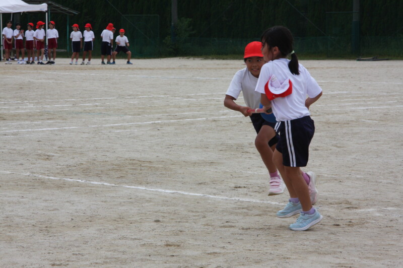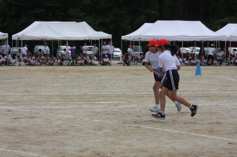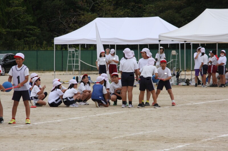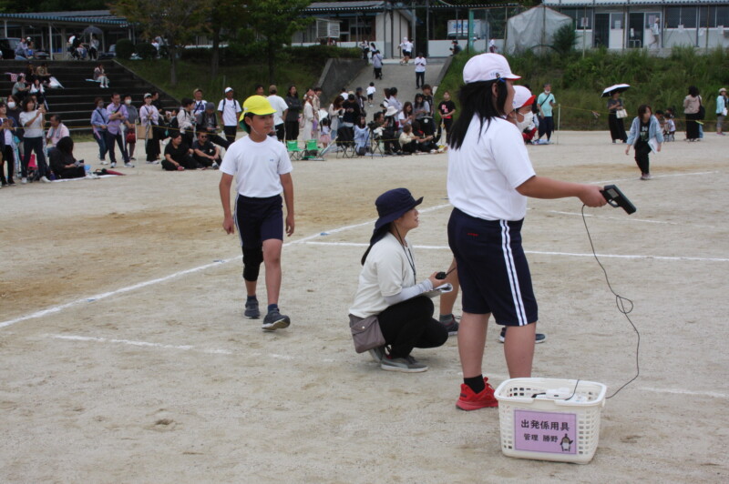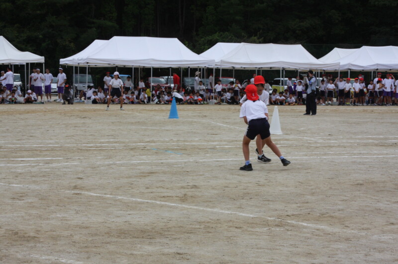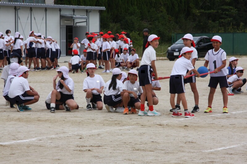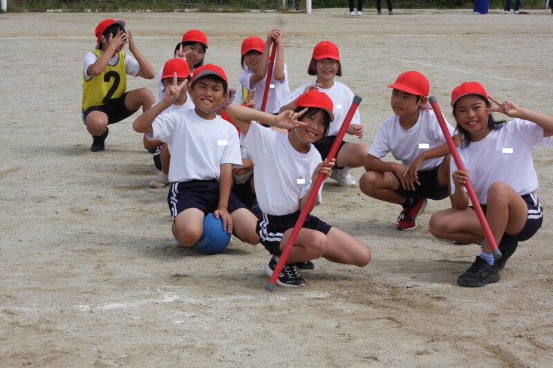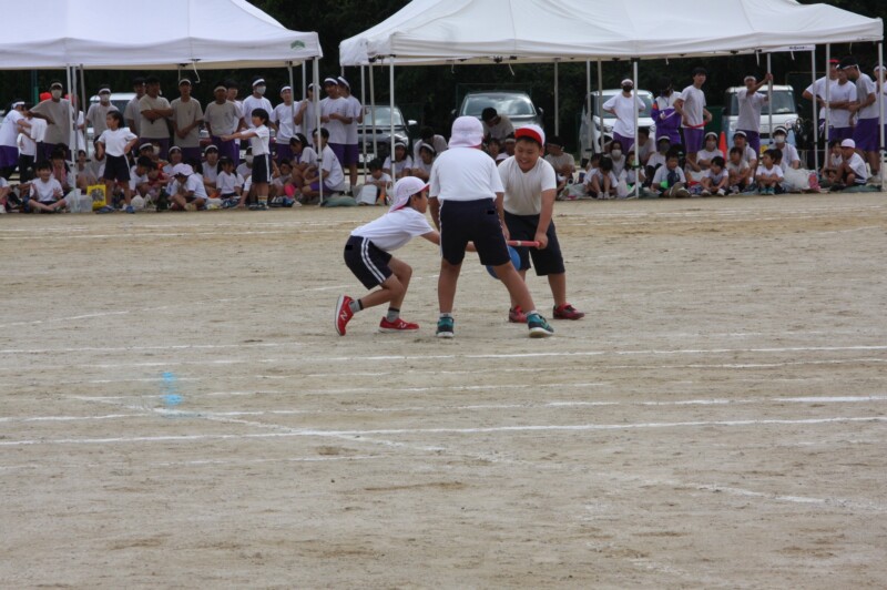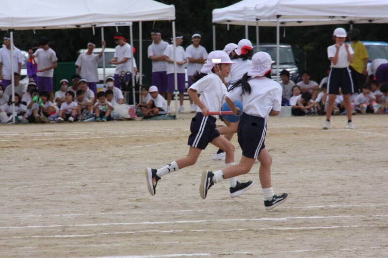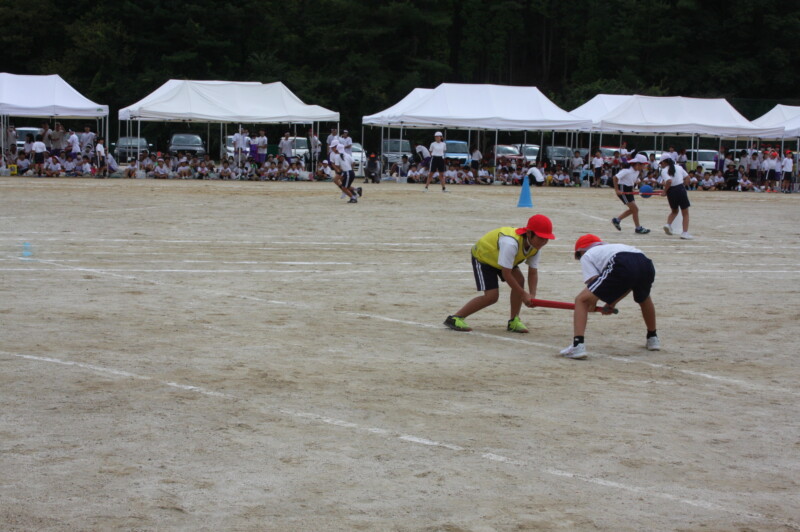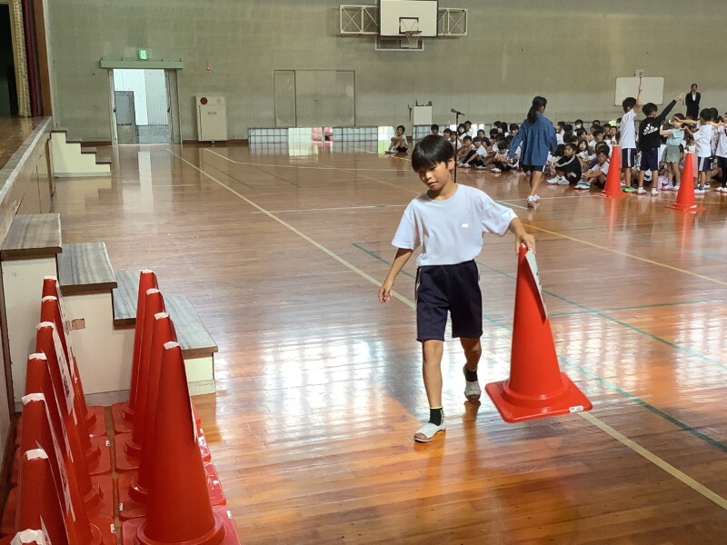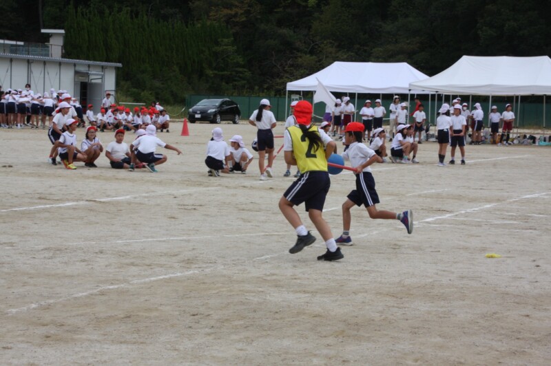 そしてここからは「スポーツフェスティバル」の特集です。4年生の競技「勝利への橋渡し」です。ペアで2本の棒を持ち、その棒の間に上手にボールを挟んで運ぶ競技です。コーンを回るなど、ペアでの連携が必要なので、4年生徒はいえ、競技の難易度は高いです。