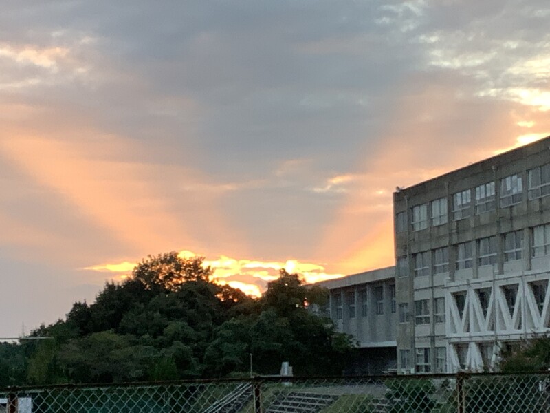 ちょうど体育館越しに太陽が沈んでいくところでした。