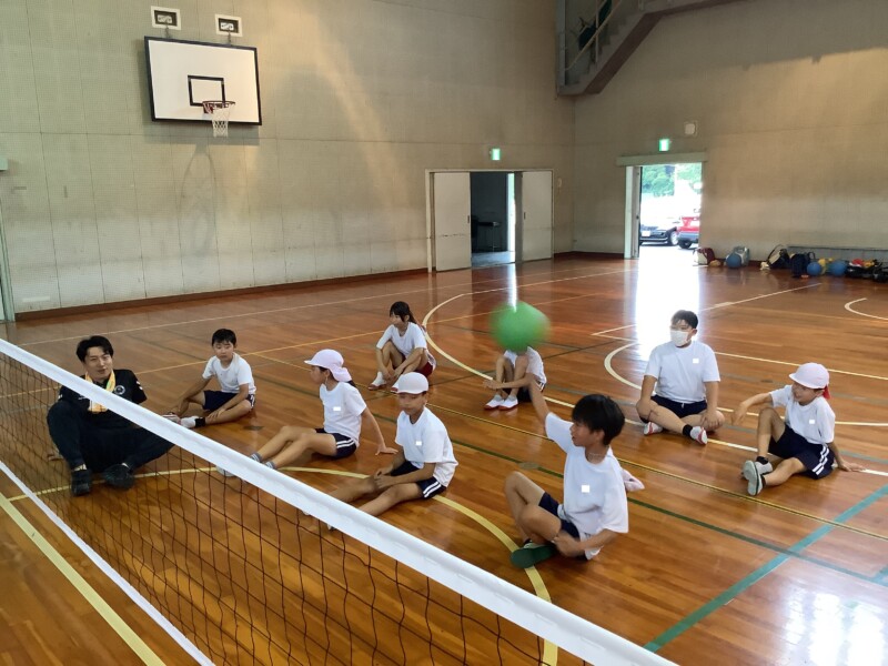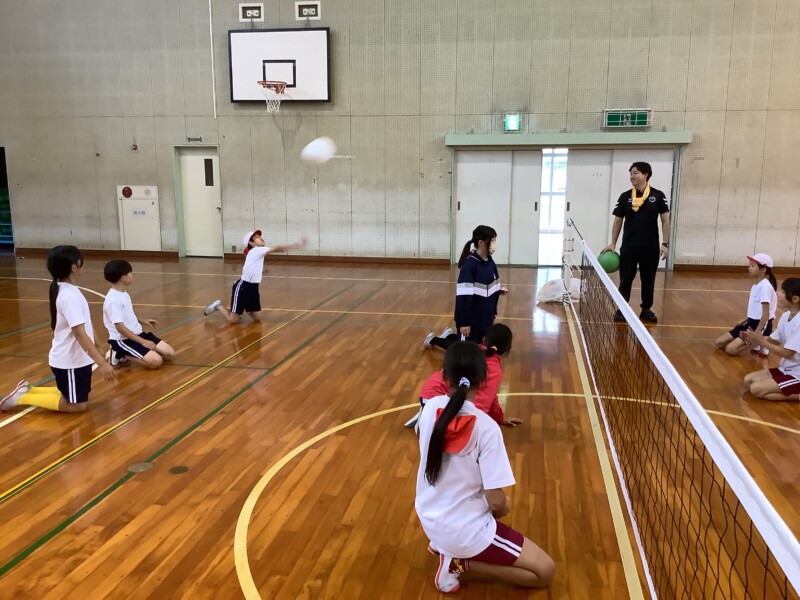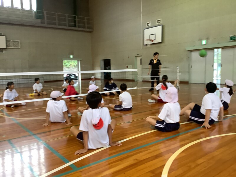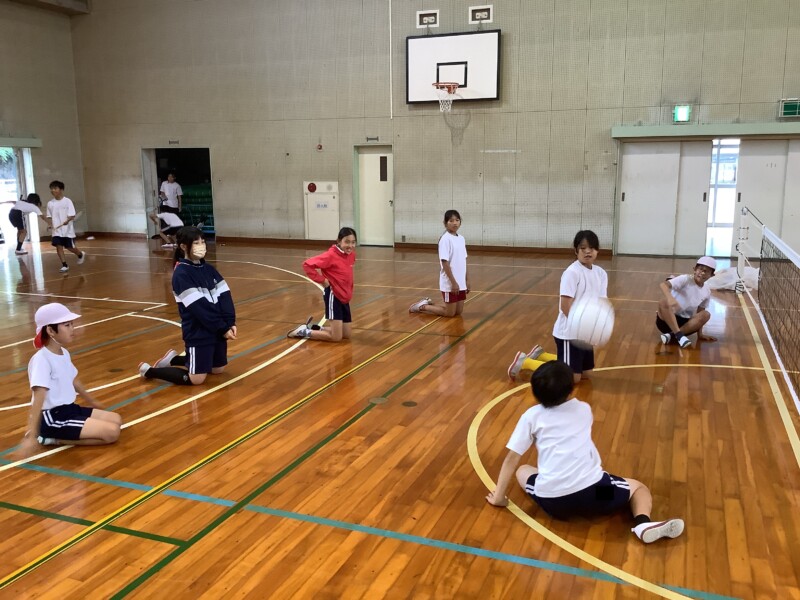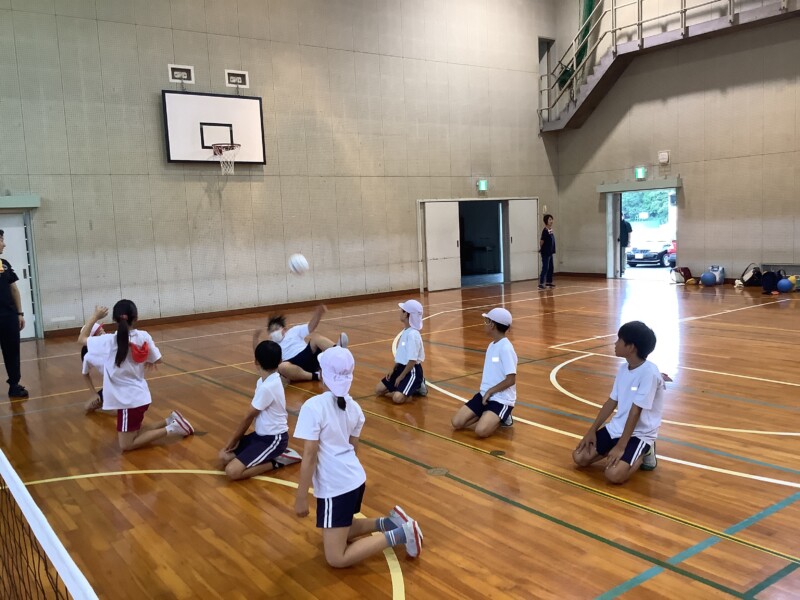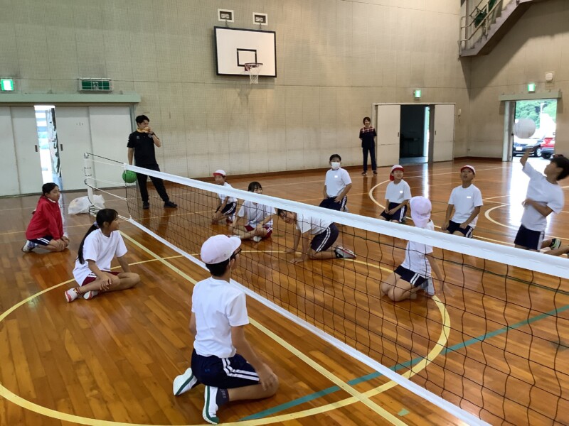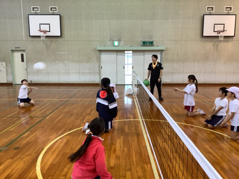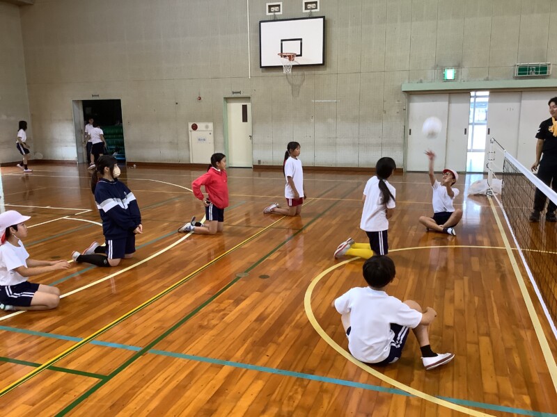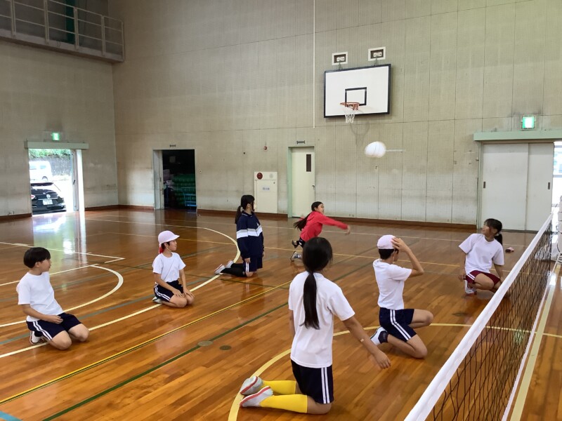 何と、「シッティングバレーボール」です。パラリンピックなどでは「パラバレー(座位)」というように表現されています。ちょうど6年生のみなさんは体育でもバレーボールに取り組む時期ですが、座ってのプレーとなると、まったく感覚が違います。