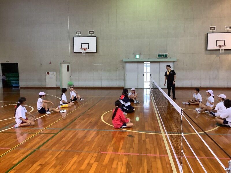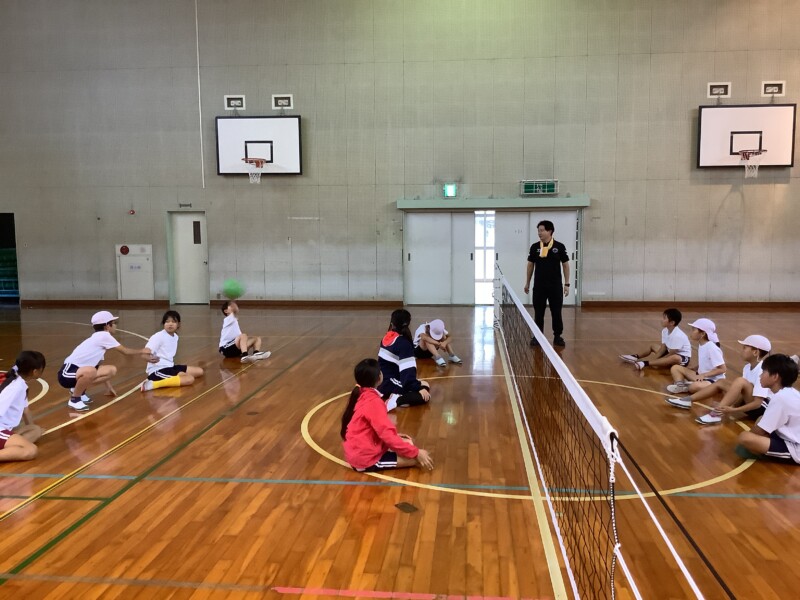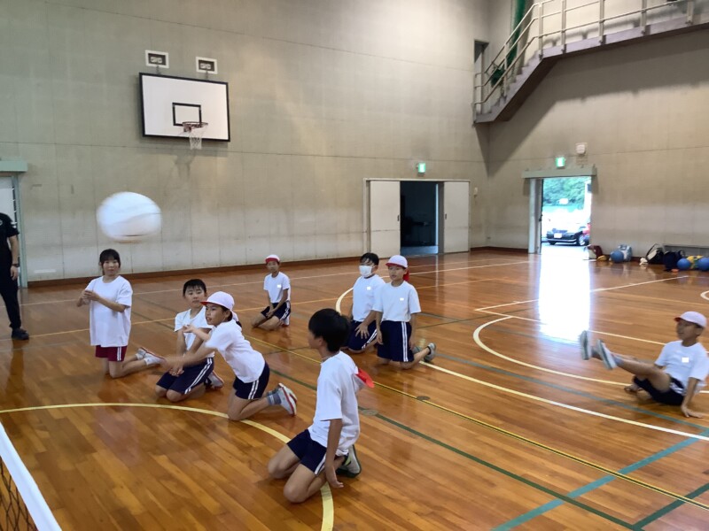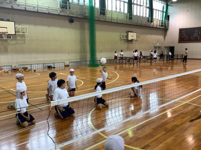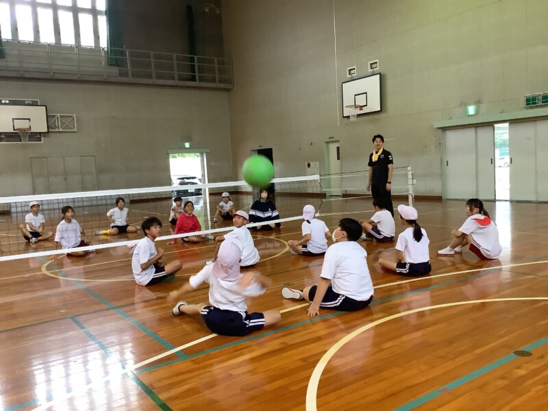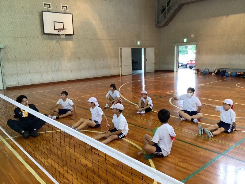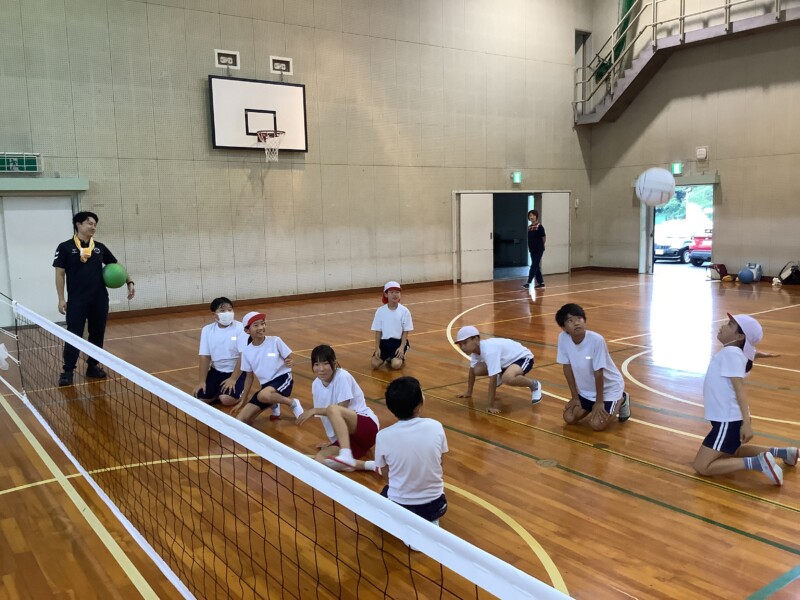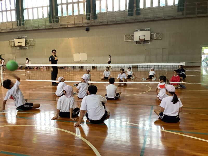 何と、「シッティングバレーボール」です。パラリンピックなどでは「パラバレー(座位)」というように表現されています。ちょうど6年生のみなさんは体育でもバレーボールに取り組む時期ですが、座ってのプレーとなると、まったく感覚が違います。