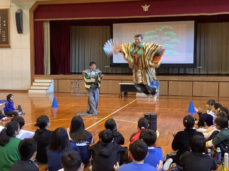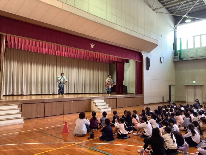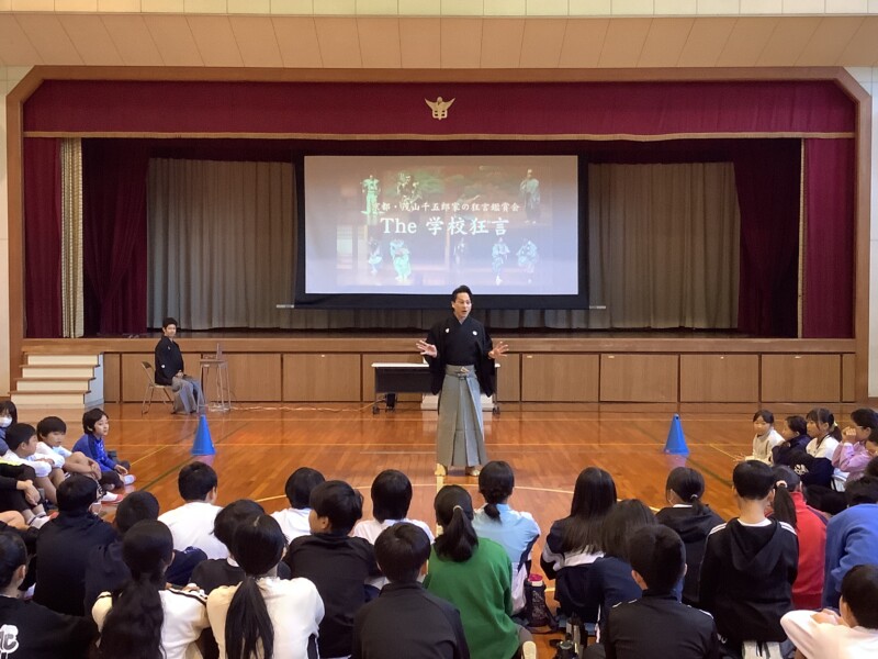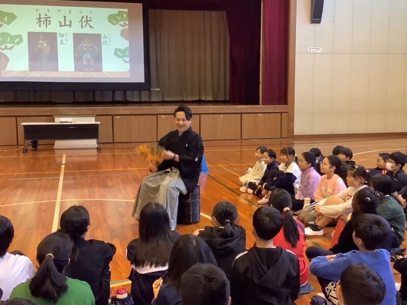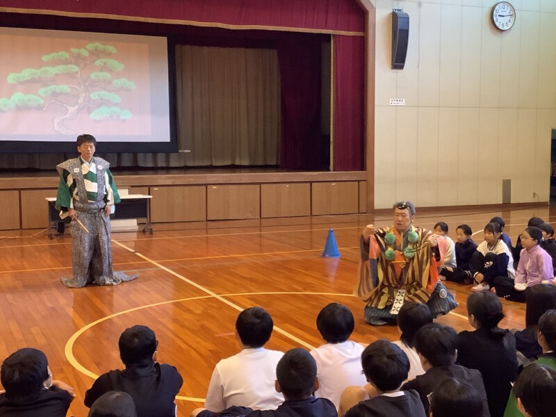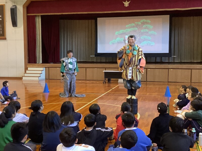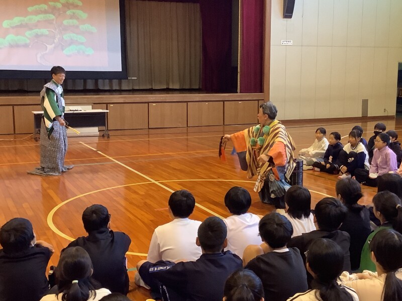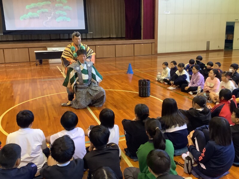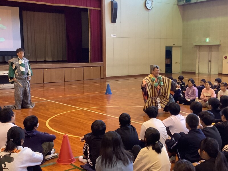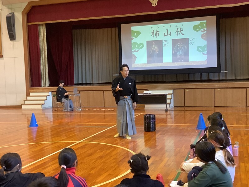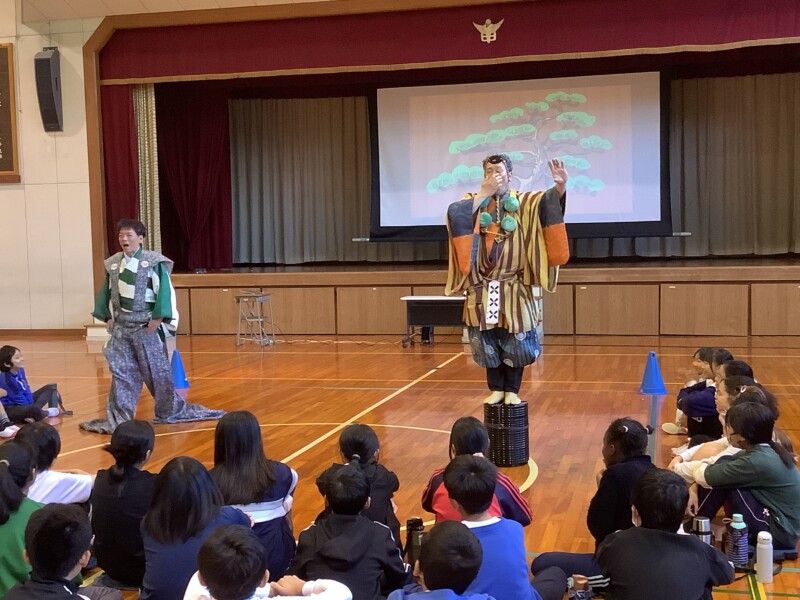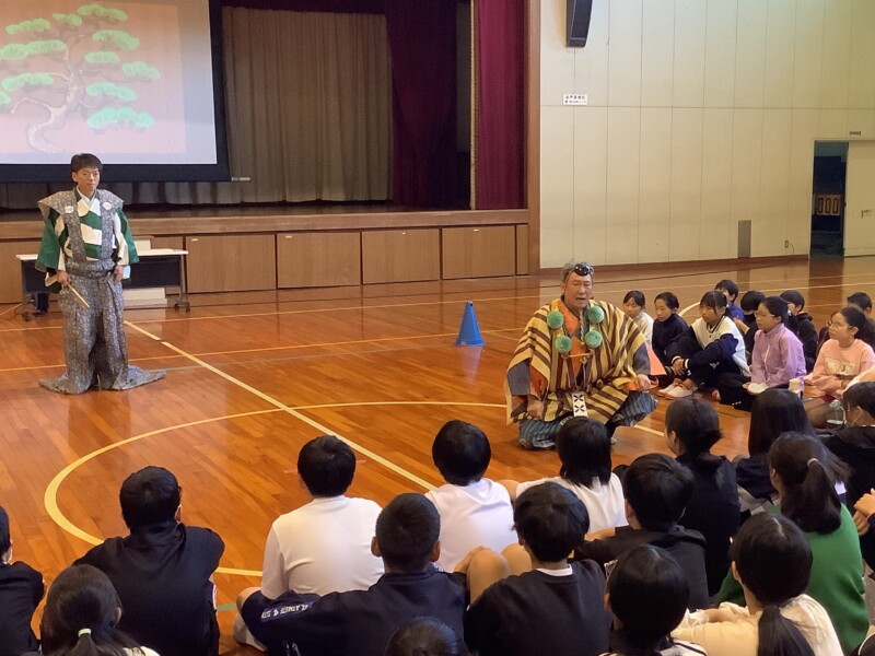 初めに、6年生が国語で「狂言」を学ぶことから、そのための特別授業を行っていただけました。「狂言」をこれまでより少し身近に感じたり、その面白さを実際に体験したりすることができました。きっとこれからの「狂言」の授業にもつながっていくと思います。