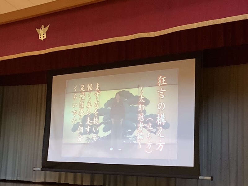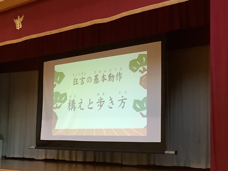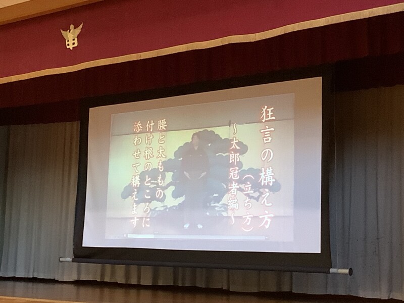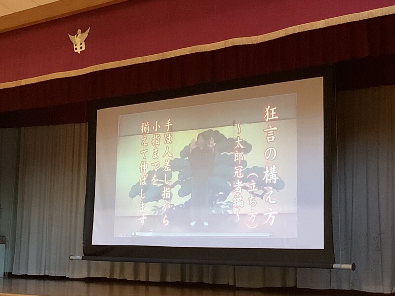 続いては、6年生向けに、「狂言」の所作を教えていただきました。