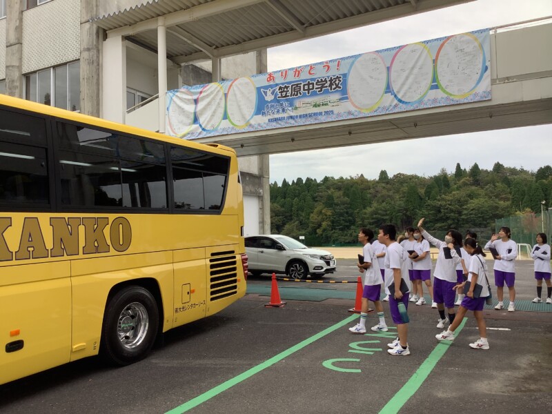 バスに乗車すると、体育館へ保健体育の授業jに向かう中学生が、急遽、お見送りをしてくれました。