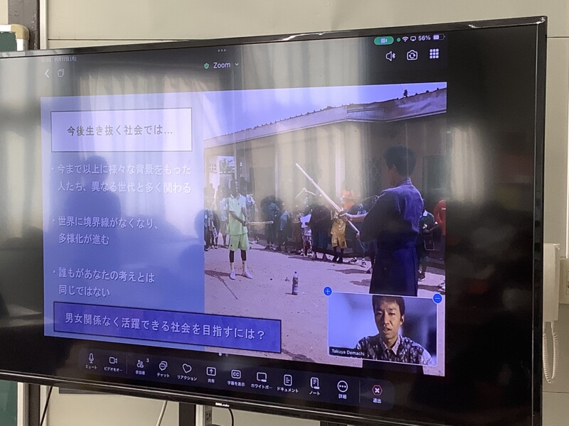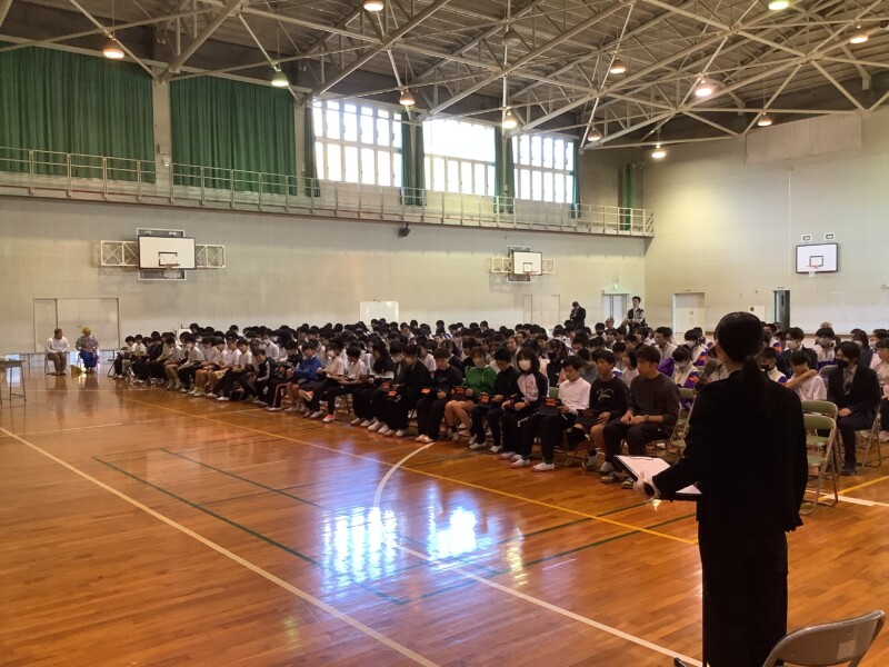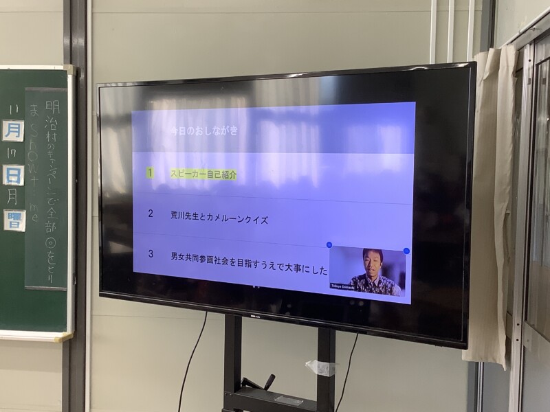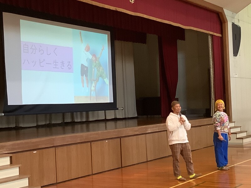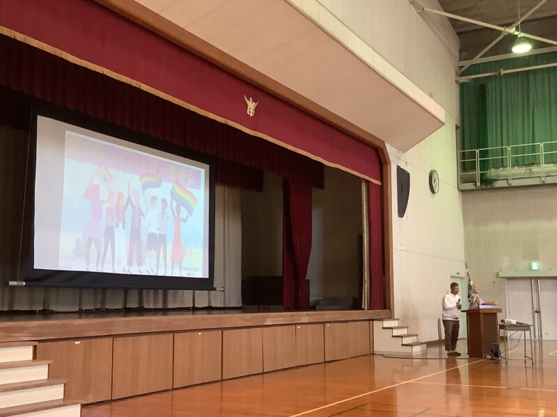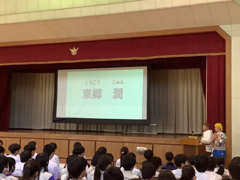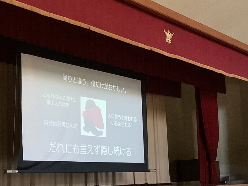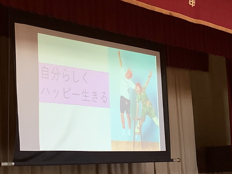 大阪から東郷潤さん、結香さんをお迎えして、小学6年生から中学3年生までが一緒に視聴しました。東郷潤さんは性別マイノリティー(LGBTQ)の1つで、身体の性別と心の性別が異なる「トランスジェンダー」として、女性としてお生まれになり、心は物心ついたころから男性だったご自分の生い立ちを紹介しながら「自分らしく生きることの幸せ」や「互いに違いを認め合えるようになってほしい」という願いをもって児童生徒に語りかけました。写真を見せながら、時には軽妙に、そして時にはパートナーである結香さんとの心が弾むやり取りを交えながらのお話に、児童生徒は心を惹きつけられました。