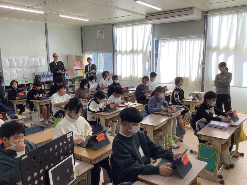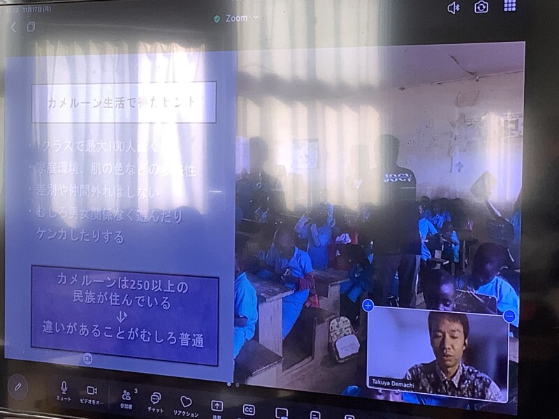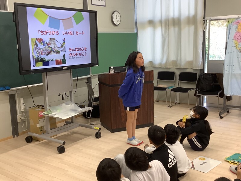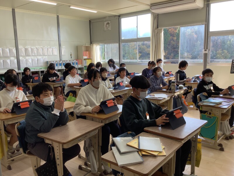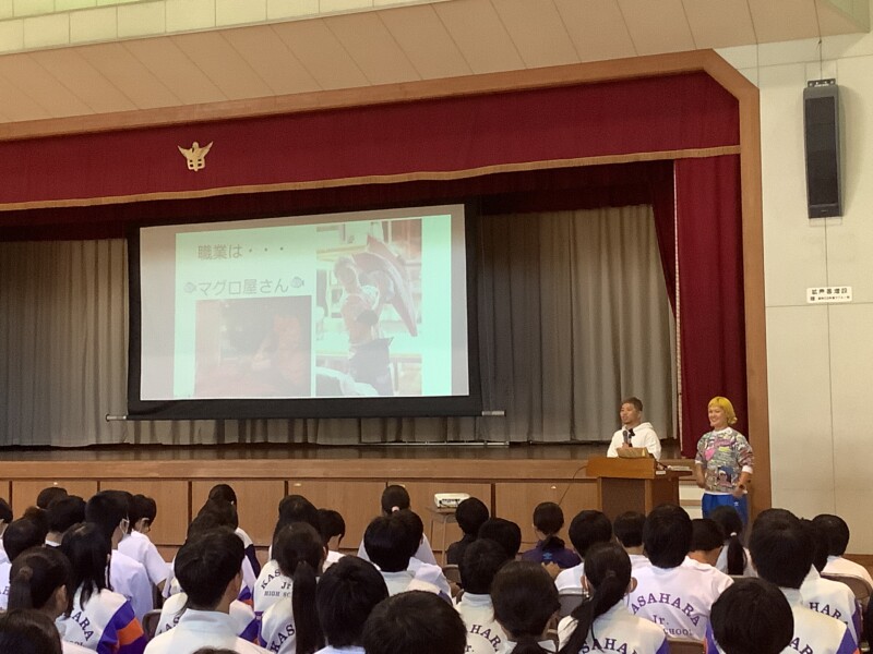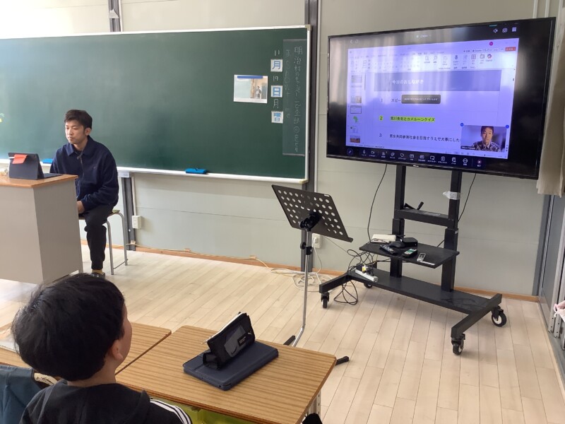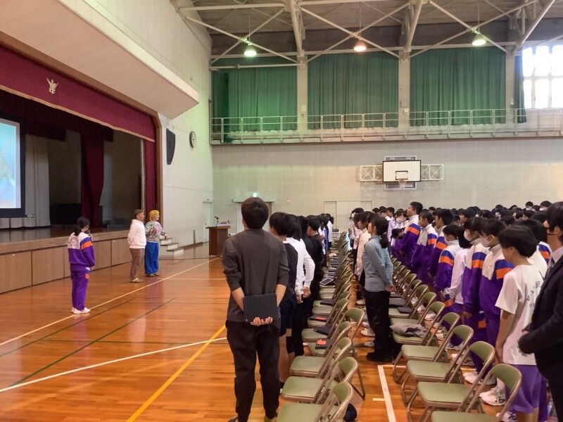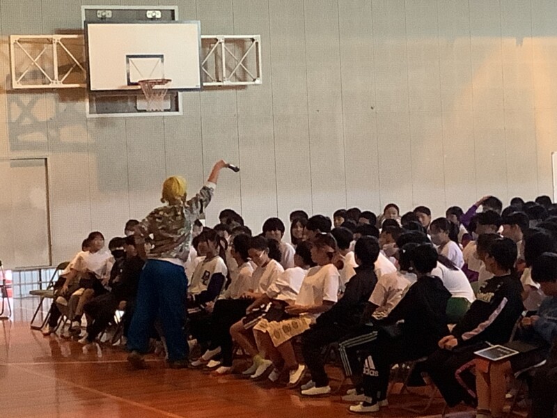 大阪から東郷潤さん、結香さんをお迎えして、小学6年生から中学3年生までが一緒に視聴しました。東郷潤さんは性別マイノリティー(LGBTQ)の1つで、身体の性別と心の性別が異なる「トランスジェンダー」として、女性としてお生まれになり、心は物心ついたころから男性だったご自分の生い立ちを紹介しながら「自分らしく生きることの幸せ」や「互いに違いを認め合えるようになってほしい」という願いをもって児童生徒に語りかけました。写真を見せながら、時には軽妙に、そして時にはパートナーである結香さんとの心が弾むやり取りを交えながらのお話に、児童生徒は心を惹きつけられました。