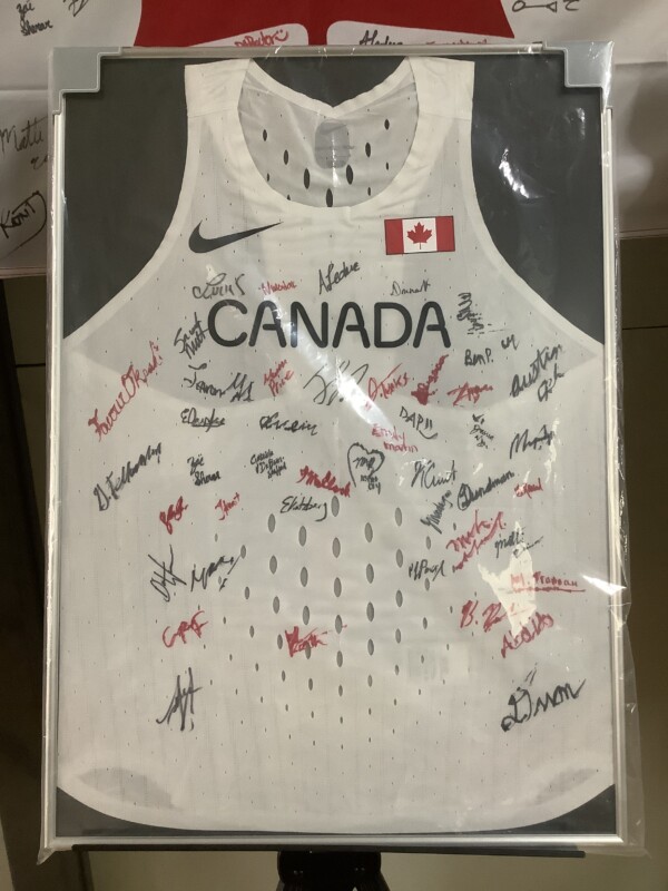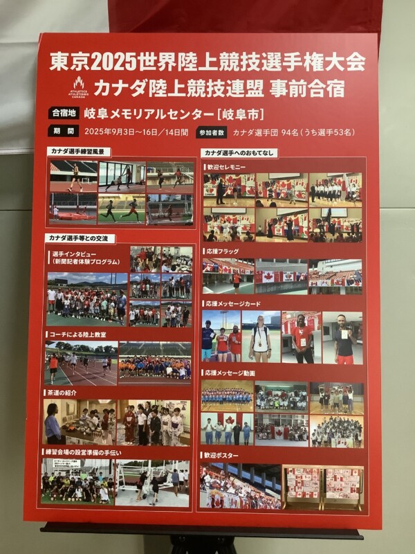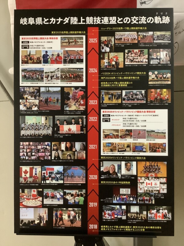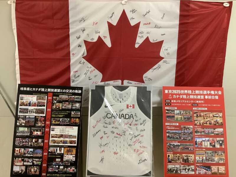 笠原小学校では「岐阜県とカナダとのホストタウン連携推進事業」に参画していることから、今年度も夏休み前に東京2025世界陸上に出場するカナダ選手団との交流活動を行ってきました。今回、応援フラッグの製作、応援メッセージ動画の製作、応援メッセージカードづくり、そして事前合宿に参加している選手への取材活動のお礼にと、カナダ陸上チームからサイン入りカナダ国旗、カナダ選手団のサイン入り陸上競技ユニフォーム、そして岐阜県からは活動を紹介するパネルを校内展示用に貸し出していただけました。