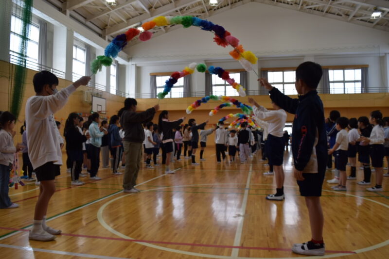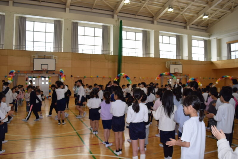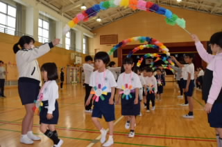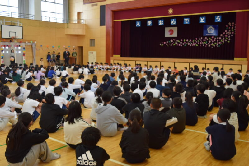 4月 14 2026 笑顔いっぱいの1年生を迎える会 朝の活動の時間、1年生を迎える会を行いました。児童会や6年生、5年生が準備、進行し、全校で新1年生35名を温かく迎え入れました。2年生からメダルをプレゼントされた1年生の子たちは、とてもうれしそうでした。どの学年も、元気いっぱい、とてもよいスタートが切れています。
