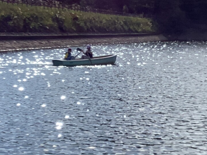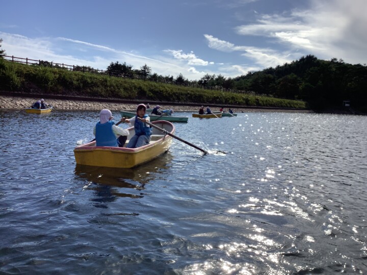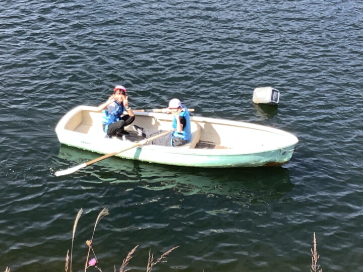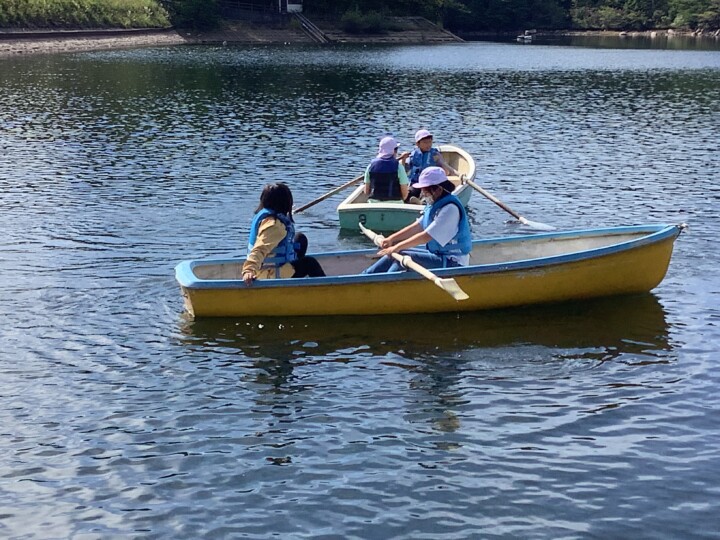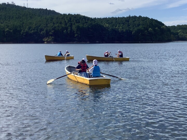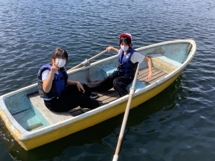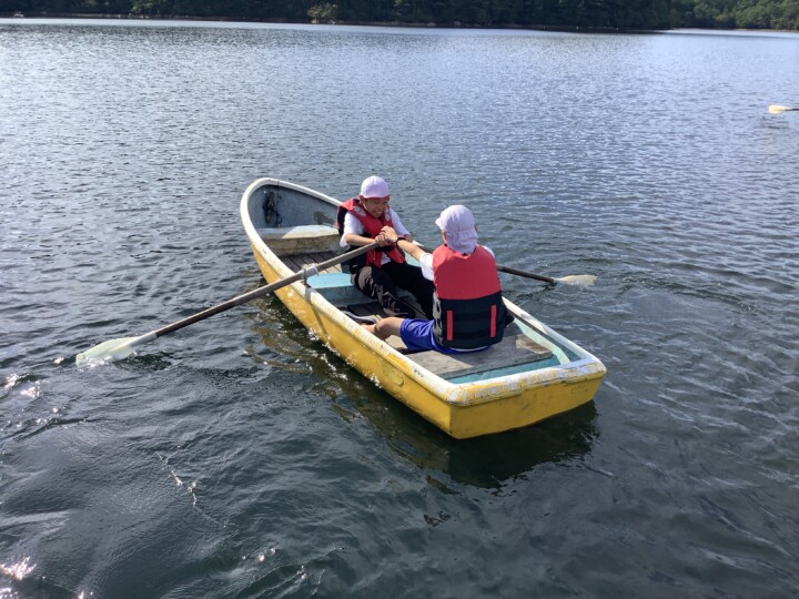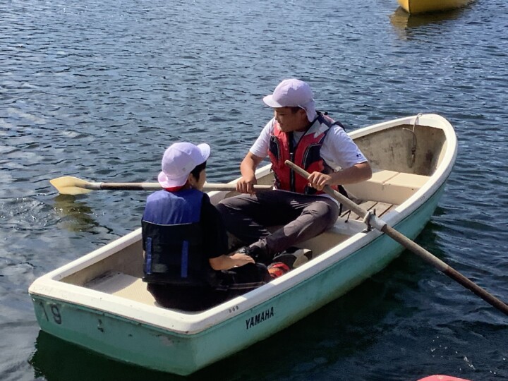 ボート体験です。まずは説明を聞いて、動きをイメージします。初めは、なかなか進まず、岸の近くに固まっていました。進むように息を合わせて、時間いっぱい繰り返し漕ぎ続けました。最後には遠くまで向かっているチームもありました。初めての体験に緊張しながらもみんなやり切ったいい笑顔!船上からの景色は絶景だったようです。