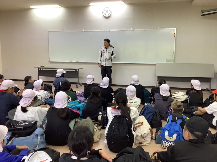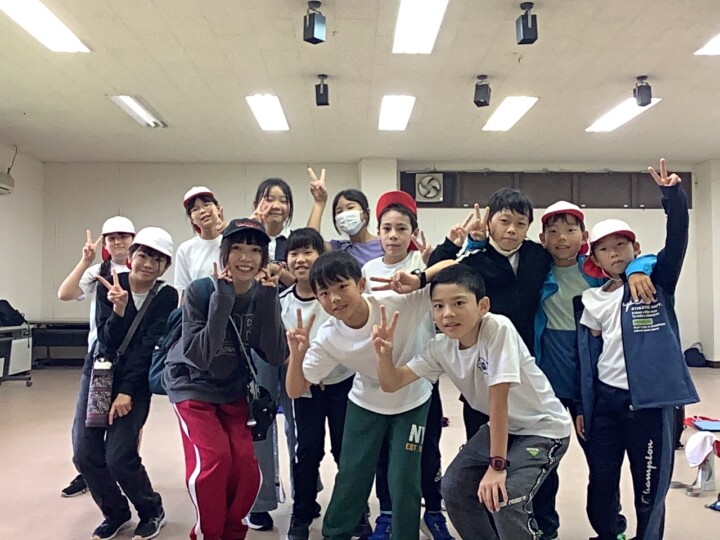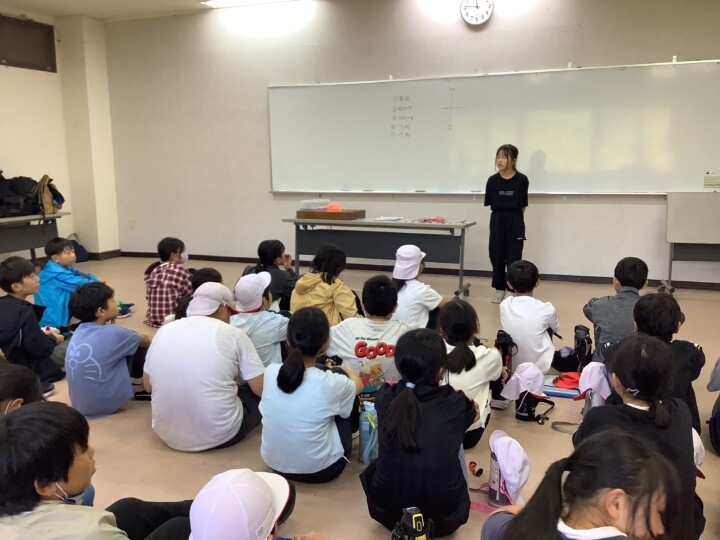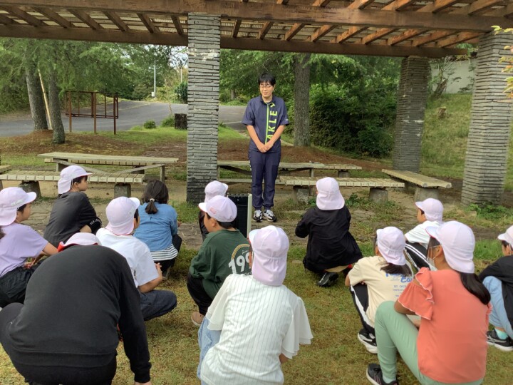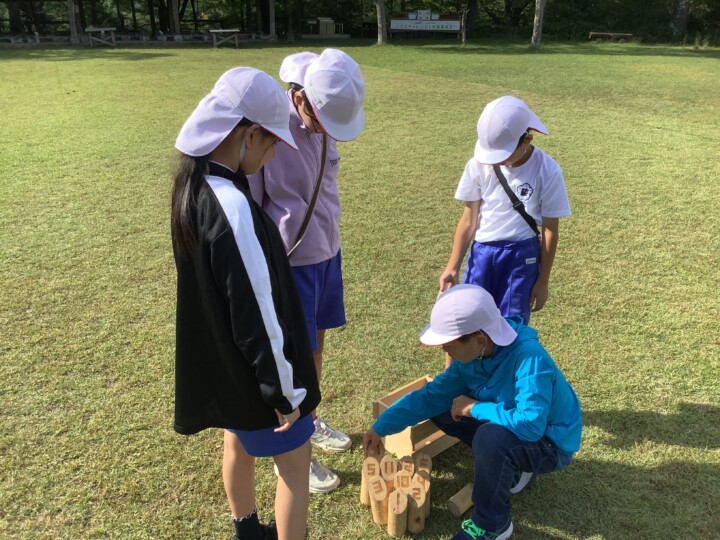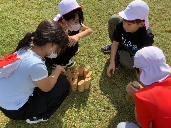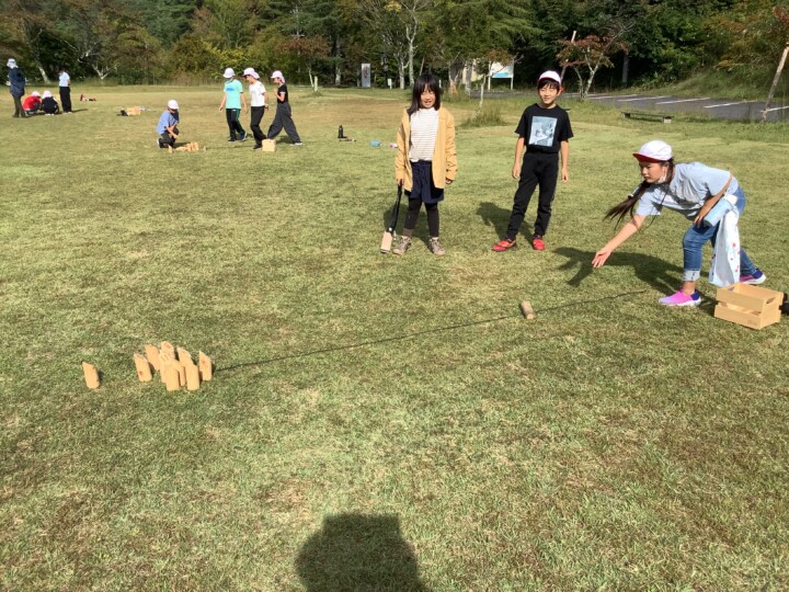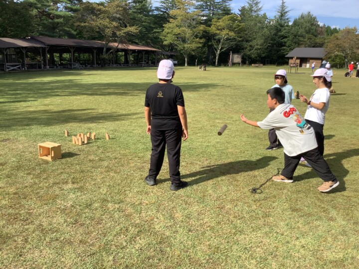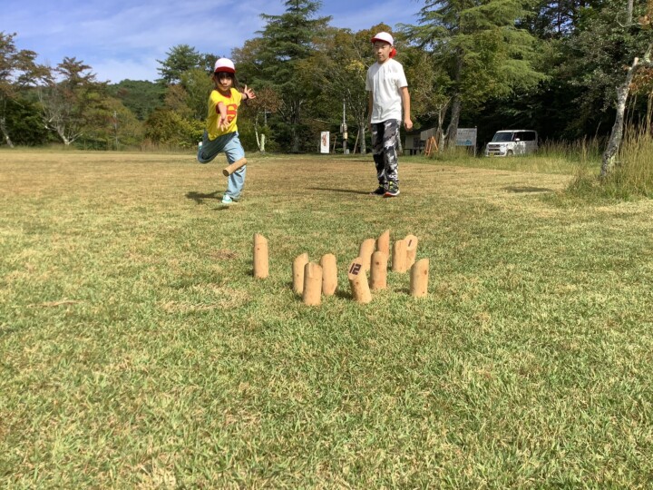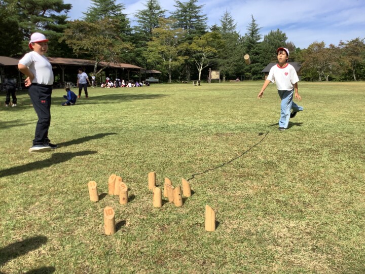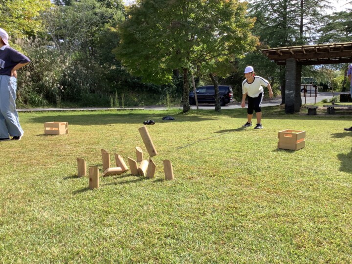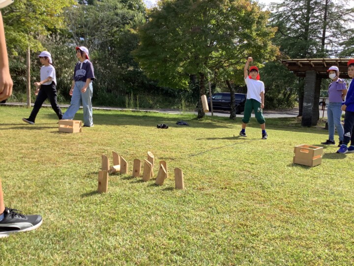 モルック体験です。アンダースローで木の棒を投げて木を倒し、点数を足して50点にするゲームです。なかなかぴったりにするのは難しいみたいです。「あと1点だったのにー。」と悔しそうな様子。繰り返しているとみんなコントロールが上手になって、遠くまで飛ばしたり、縦投げで点数をねらいうちできるようになっていました!個人戦が終わるとチーム戦で対決も!仲間と励まし合いながら、歓声が上がっていました。