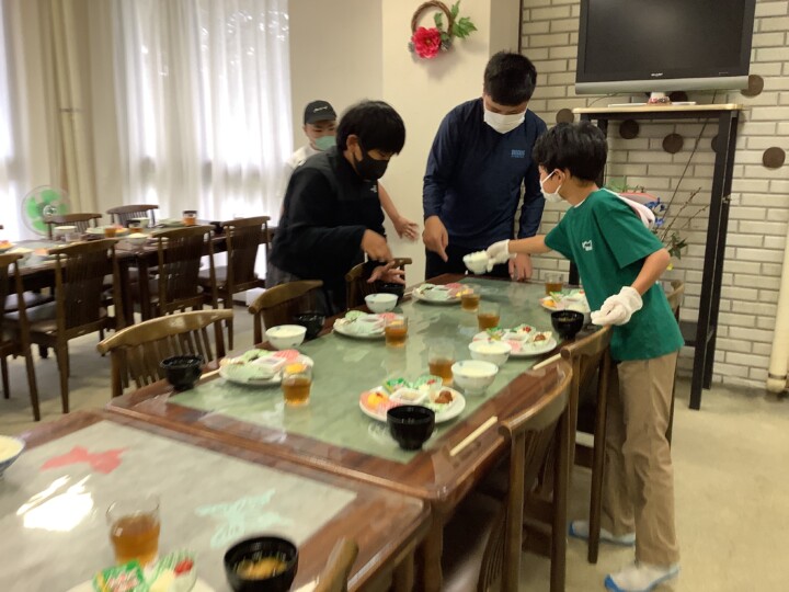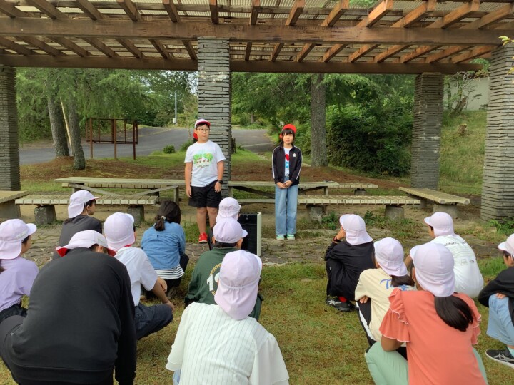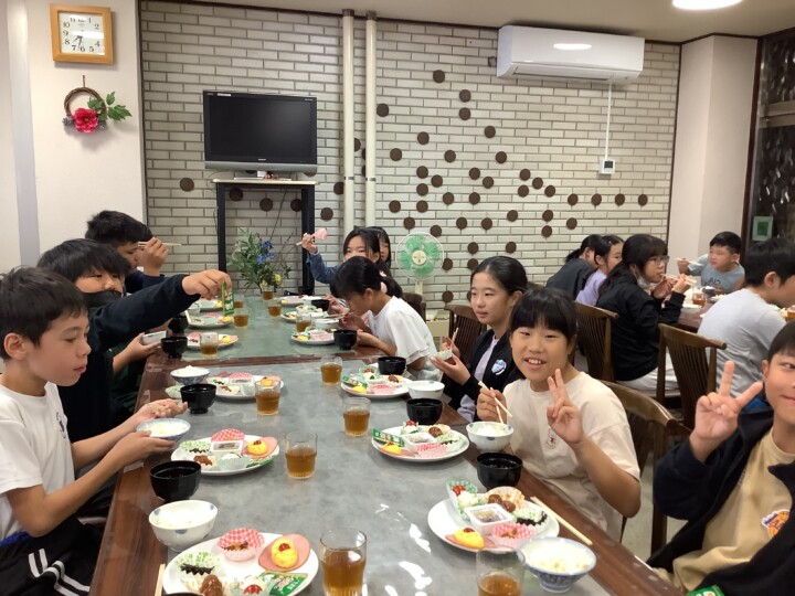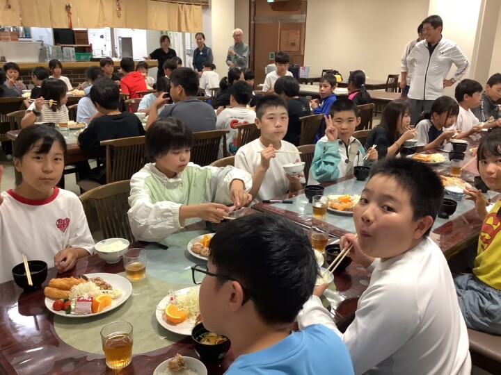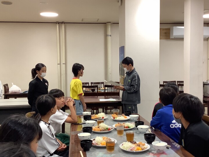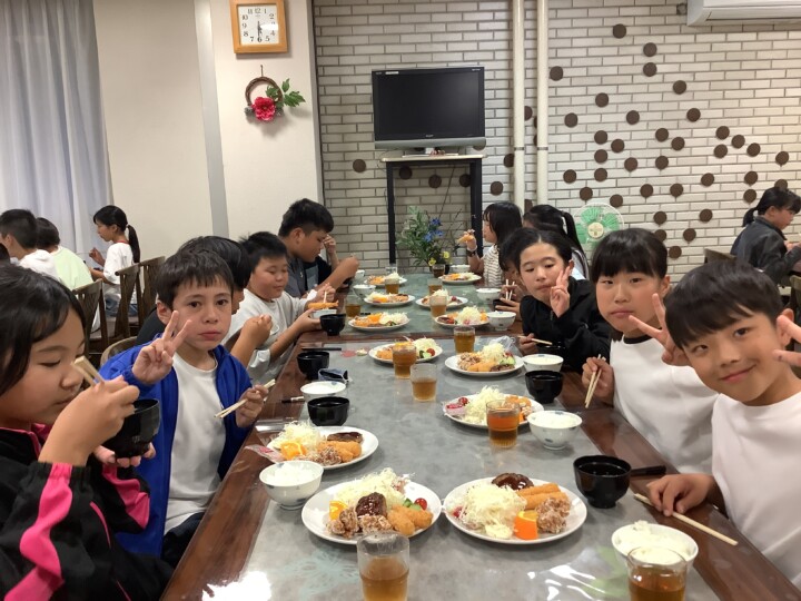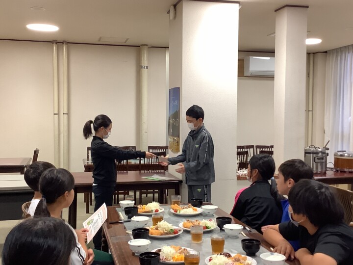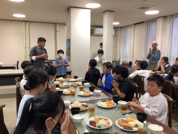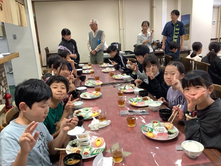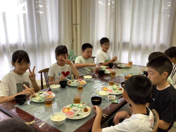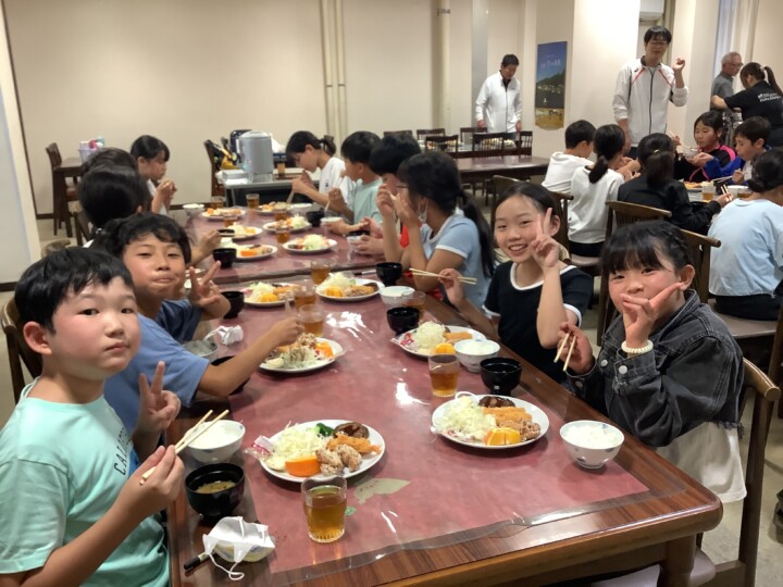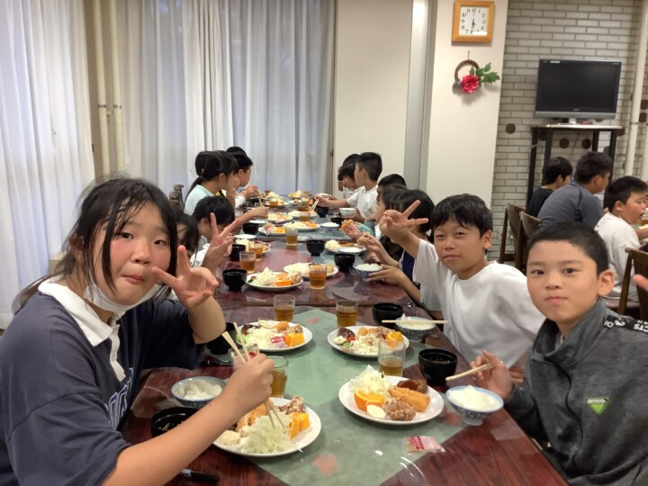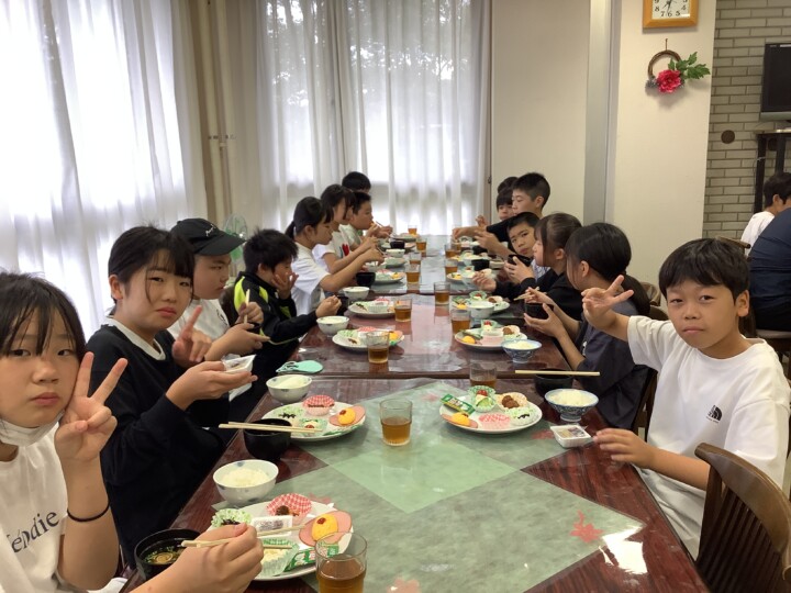 まずは、オリエンテーリングの1位から4位の表彰をしました。どのグループも頑張りましたね。いただきますをして夜ご飯を食べました。エビフライ、ハンバーグなど豪華メニューに目を輝かせていました、みんなで食べるご飯はおいしいね。たくさん活動してヘトヘトでしたが、パワーチャージできましたね。
