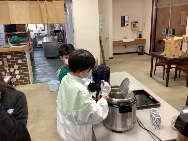 集いの後は、「お腹すいたあ」と食堂へわくわく朝ごはん!食事係が一生懸命準備してくれました。さあ、早寝早起き、朝ごはんでパワーチャージです。一日のスタート、これからいよいよカレーづくりをするために野外炊事へ向かいます!