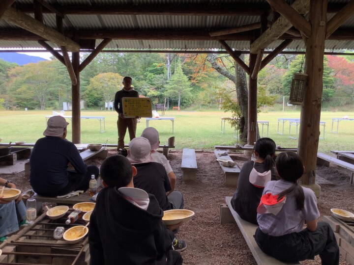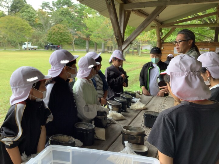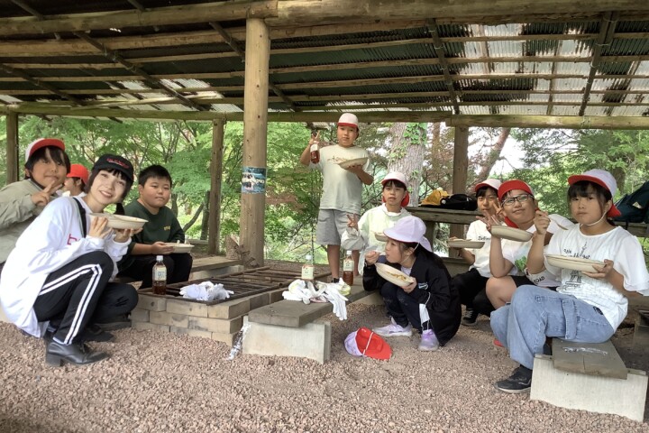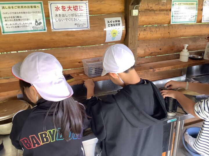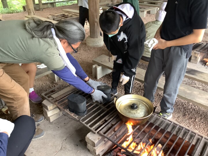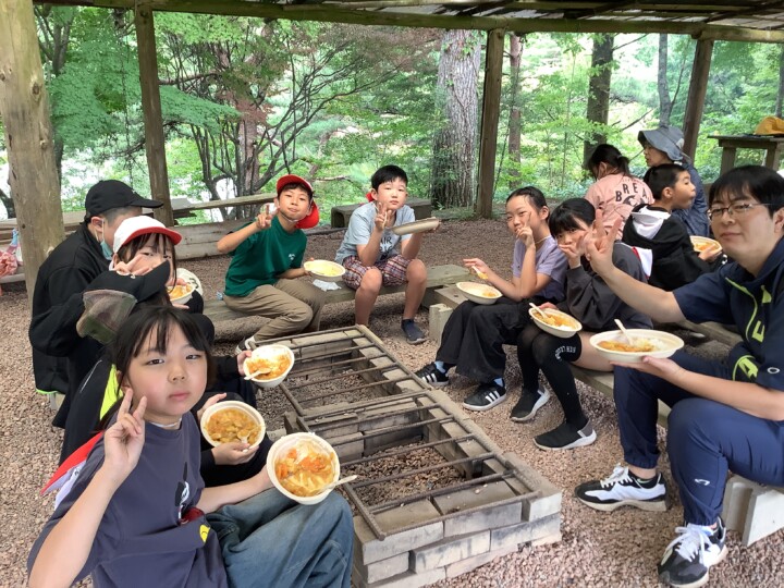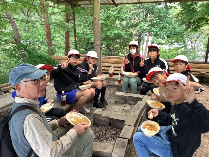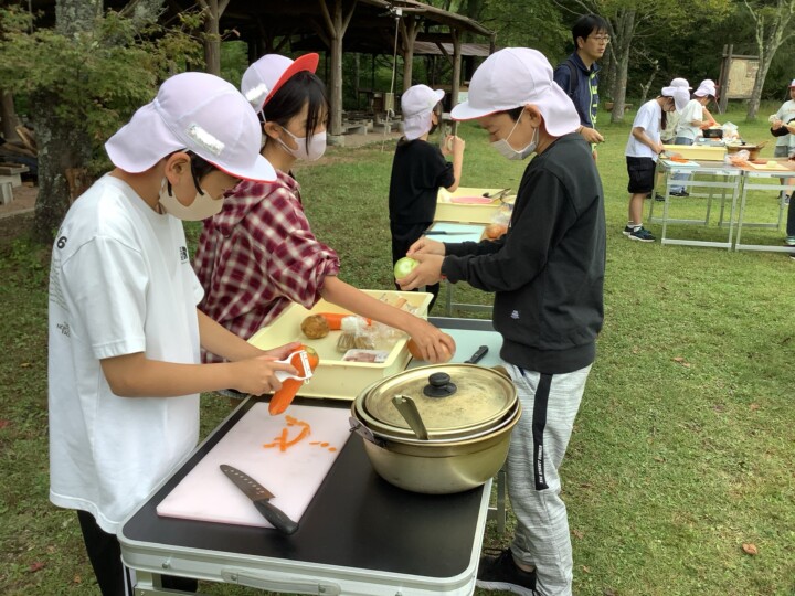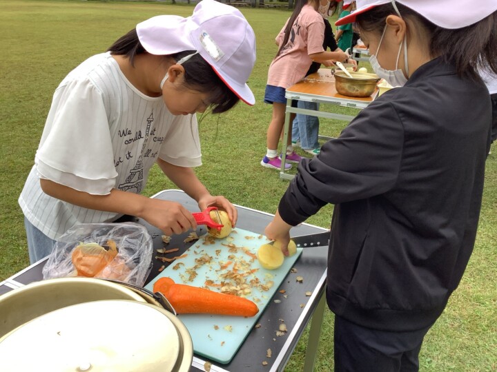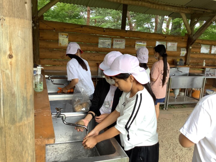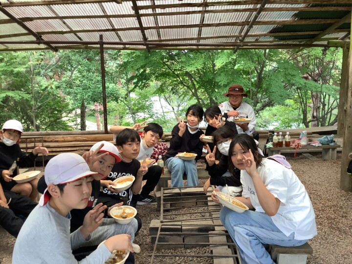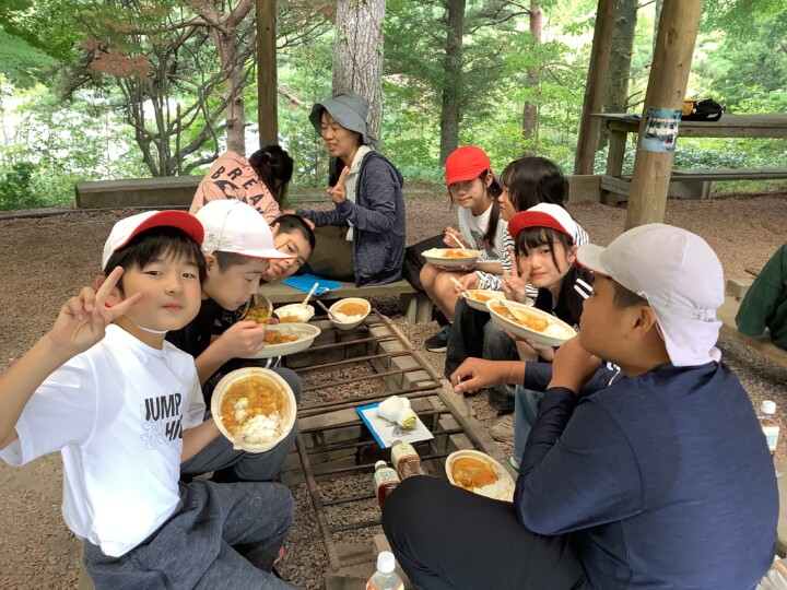 二日目最後の活動は、野外炊事でカレー作りをしました。火が消えないように木を注ぎ出す火の当番、皮を剥いて、食べやすい大きさに切った野菜、タイミングを見計らって炊けたほかほかごはん、それぞれが責任を持って作業に取り組むことができました。みんなが頑張ったおかげで、おいしいカレーが完成しました。「今までで1番おいしい!」「最高!」と大絶賛!おかわりもたくさんしていたので、鍋はあっという間に空っぽになりました。ごちそうさまでした。最後まで頑張りましたね!