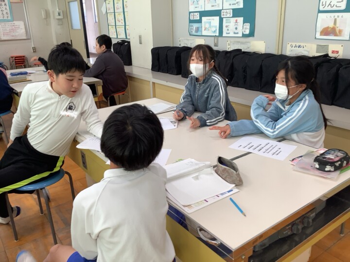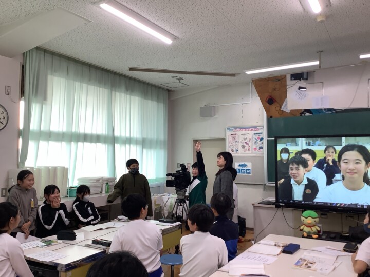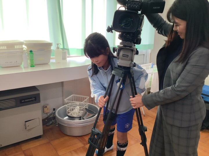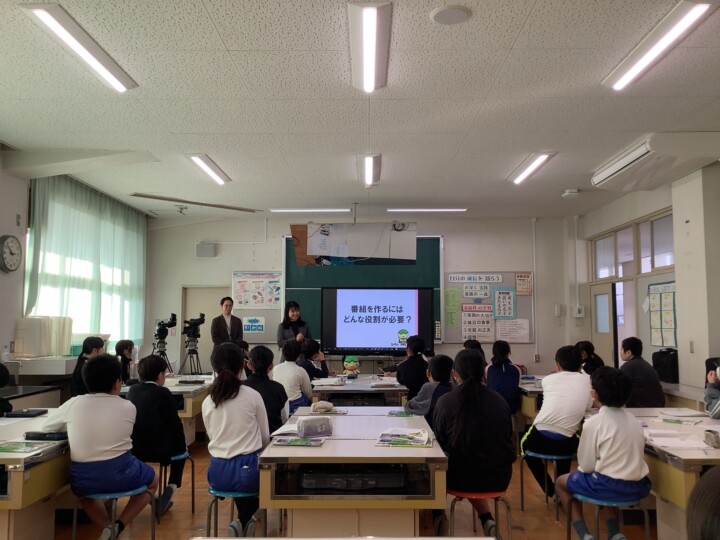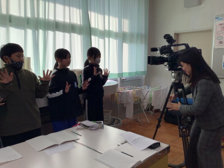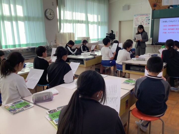 5年生の社会の時間です。多治見にあるオリベネットワークから2名の講師を招き、出前授業が行われました。まずは、テレビ番組がどのように作られているのか、様々な役割や、工程について熱心に話を聞いていました。また、10分の番組を作るのになんと15時間かけられていると知り、驚きでしたね。また後半は、アナウンサーとカメラマン体験をしました。実際に、取材用のカメラ機材を持ってピントを合わせたり、アナウンサーの早口言葉や発声練習、ニュースの原稿読みをしたりしました。どちらも初めてでしたが、原稿をスラスラよんだりカメラを上手に扱ったりして褒めてもらっていました。たくさんの苦労や努力によって一つの番組ができあがることに感動していました。貴重な経験ができましたね!