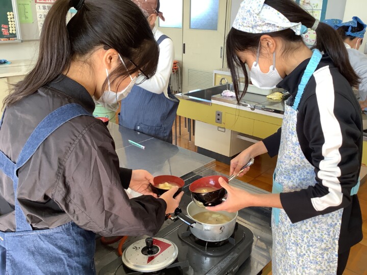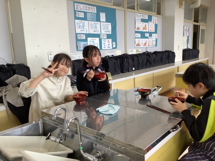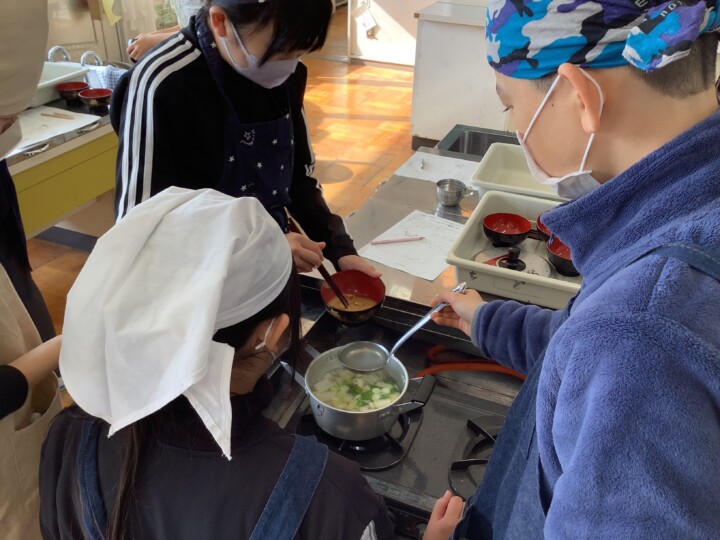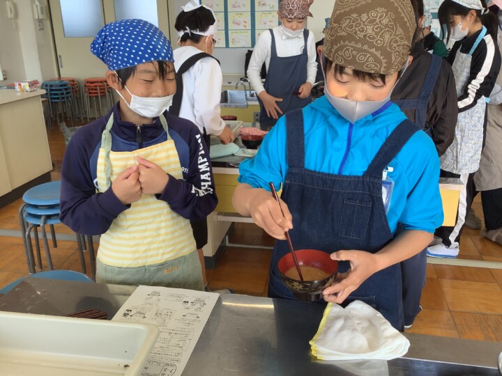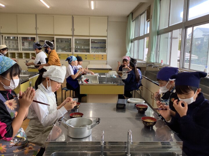 5年生の調理実習です。本日のメニューは、にぼしからダシをとる本格派みそ汁です。煮干しの腑をとり、ぐつぐつ煮込んでいると、既にいい香りがしていました。その間に、具材の油揚げ、ネギ、大根を切ります。「短冊切りってどうやってやるの?」「半分に切ってこうするんだよー」「大根はかたいから薄めに切ったほうがいいんじゃない?」と自分たちで考え、協力しながら作っていました。具材が揃い、ダシ汁でみそをといたら、いよいよ投入。「わあ、みそ汁の色になった。」「いい匂いだあ」と感動していました。最後に盛り付け、手を合わせていただきます!「ダシが効いてて、おいしい!」「あったまる〜」「みんなで作るとおいしいね!」と幸せを噛み締めていました。手際よく、片付けも終わらせ、みそ汁づくり大成功です!お家でも自分の好みのダシや具材、みそでオリジナルの一杯を作ってみてください。
