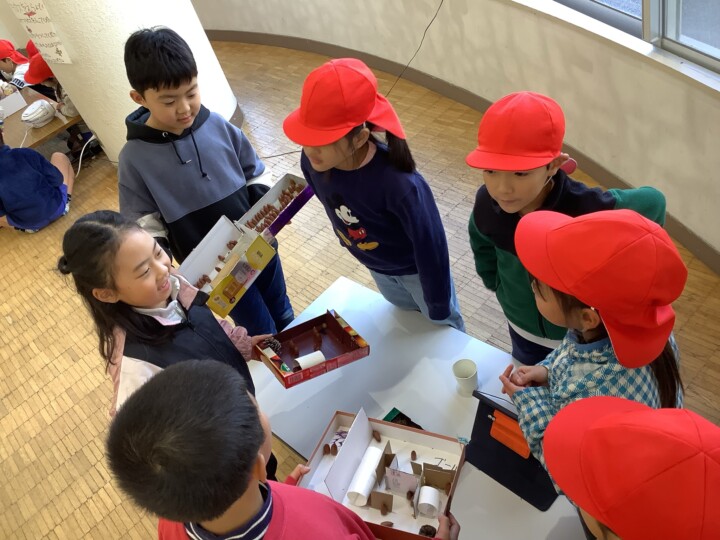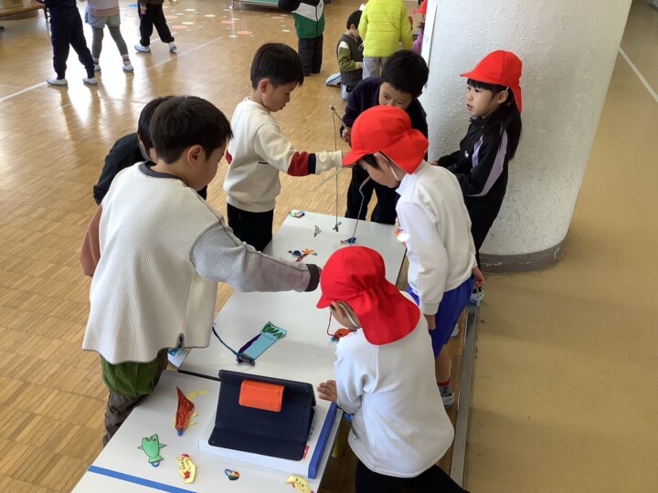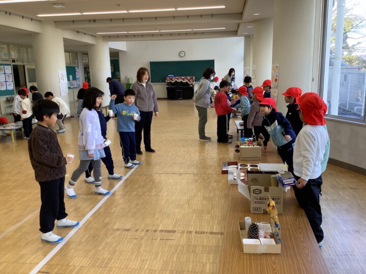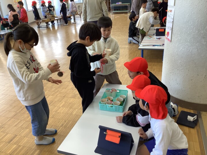 可愛らしく飾り付けされたホワイトホール、何やら賑やかな様子です。一体何が始まるのでしょうか?1年生が生活科で、2年生のお兄さん、お姉さんを招待しての秋まつりです。ひらがなやカタカナ、よりわかりやすいように絵も書いた看板やパネルを使ってゲームの説明もしていました。どんぐりごま、迷路、マラカス、魚釣り、松ぼっくりのけん玉、的入れなど楽しいおもちゃがたくさん!喜んでもらうための工夫もたくさん詰まっています。マラカスでは、1年生の頃に音楽で習った曲を選んでもらい、リズム奏をしていました。また、的入れでは、近くと遠くでラインを分けて、難しさを調整していました。1年生は、2年生が口々に「楽しい!」と言ってくれて、いい笑顔。2年生も心のこもったおもてなしに笑顔になっていました。笑顔溢れる秋祭り、大成功です!
