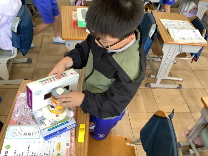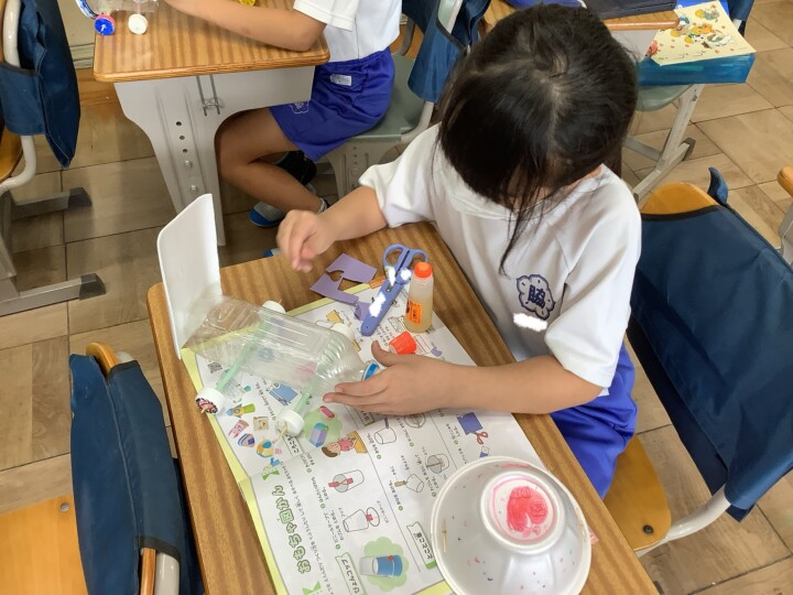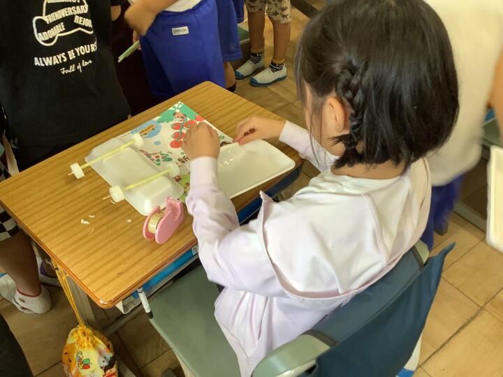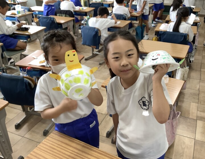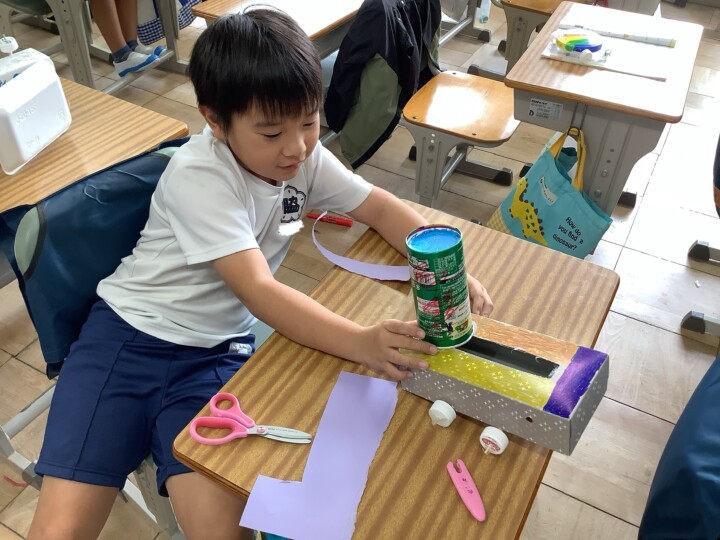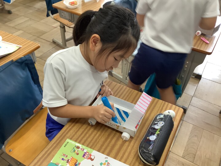 2年生の生活科です。1年生をおもてなしするために、おもちゃ作りを頑張っています。乾電池を使った、面白い動きのころころころんから始まり、風で動くヨット、とことこ車など説明をよんだり、仲間と助け合いながら準備をすすめていました。だんだんバラエティー豊富になってきましたね。お菓子の空き箱やプラスチックのケースを組み合わせて高さや長さを変えると、戦車や潜水艦もできました。さらに、「1年生喜んでくれるかなあー。」と考えながら、こだわりのイラストや模様でおもちゃを自分らしくカスタマイズしていました。カップをカメの甲羅や動物の顔に見立てるなど工夫を凝らした作品が多くできましたね。試運転も大成功!お店やさん開店に向けてさらに頑張ります!