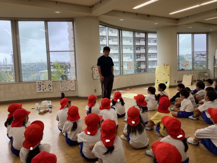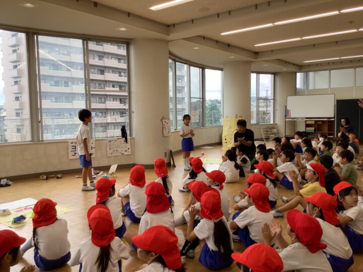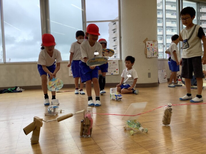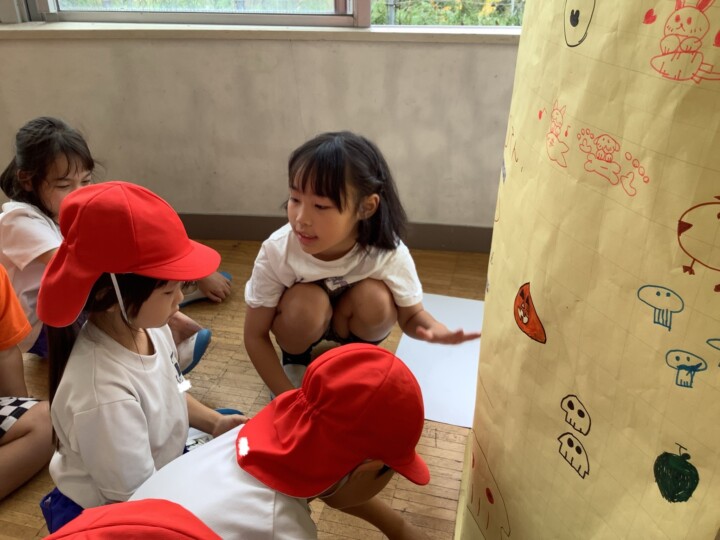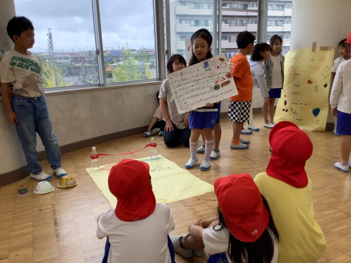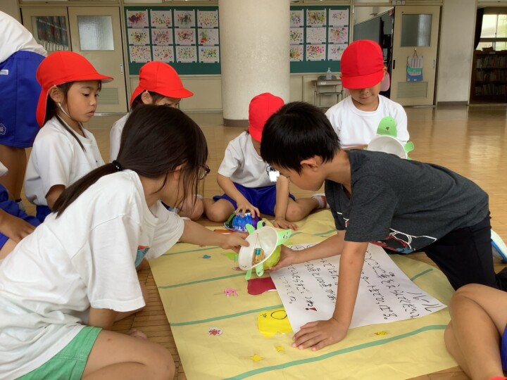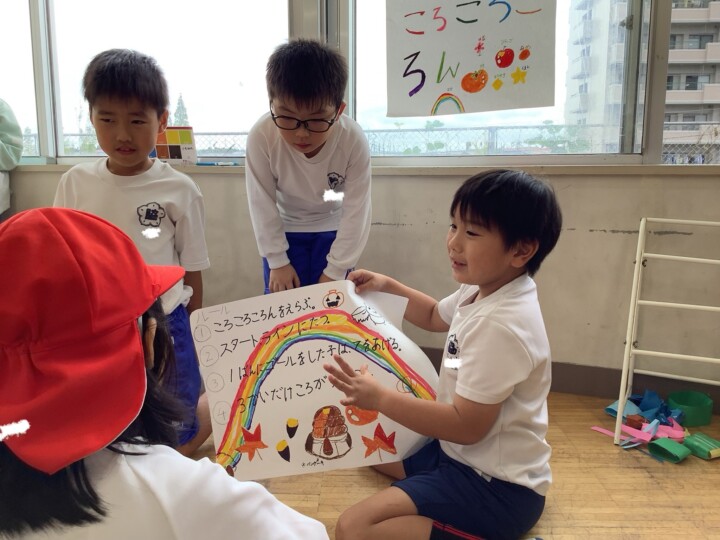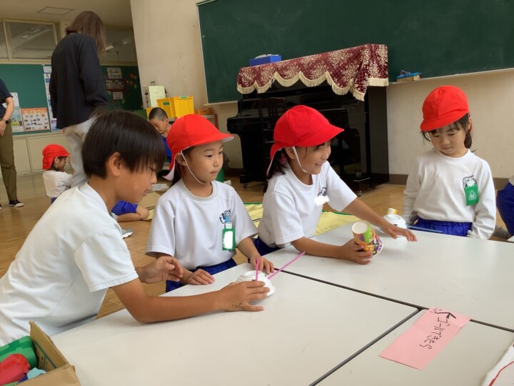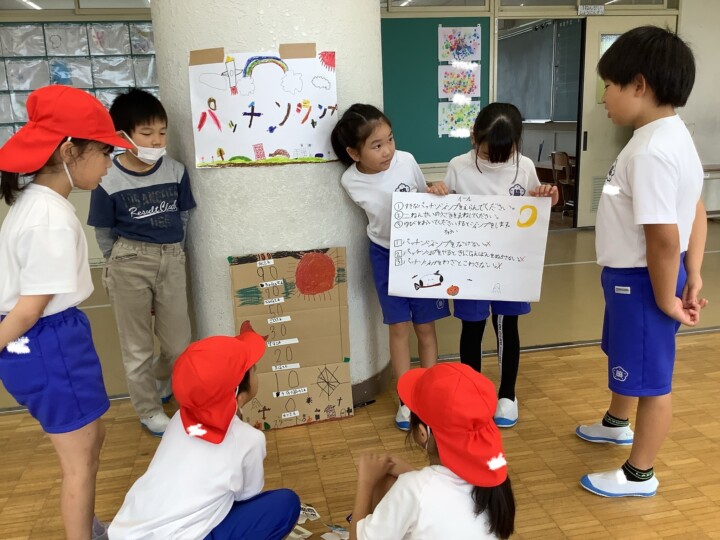 今日は2年生が生活科の時間に頑張って準備してきたお楽しみの、おもちゃランドに1年生を招待しました。ころころころんを転がすだけでなく、あたりをつけたり、とことこ車をかわいく亀の形にして、点数をつけたりと、どうしたら1年生が喜んでくれるかなあと工夫されたお店屋さんがたくさんありました。1年生がわかりやすいようにお手本を見せる姿、遊びのルールや注意点を上手に説明する姿は、頼もしいお兄さん、お姉さんでしたね。1年生は、遊ぶのが楽しくて終わるのが惜しいほど喜んでいました。そんな姿を見て2年生は嬉しそうに笑顔になっていました。おもちゃランド大成功!たくさん頑張りましたね!