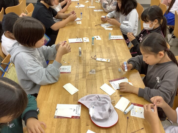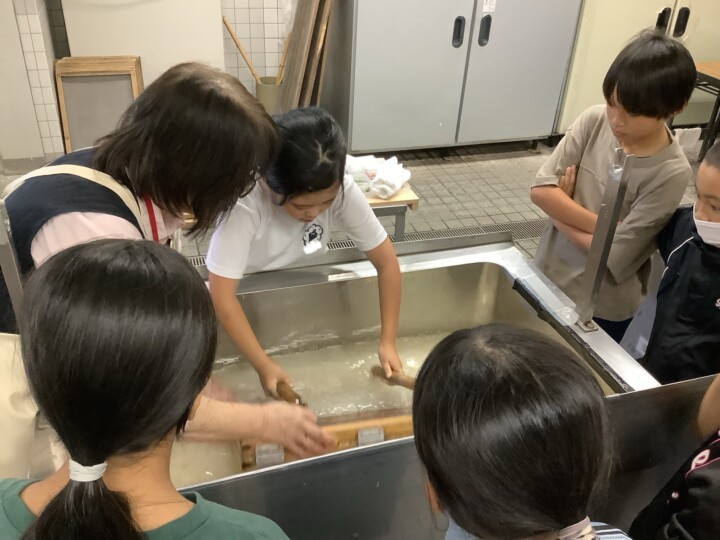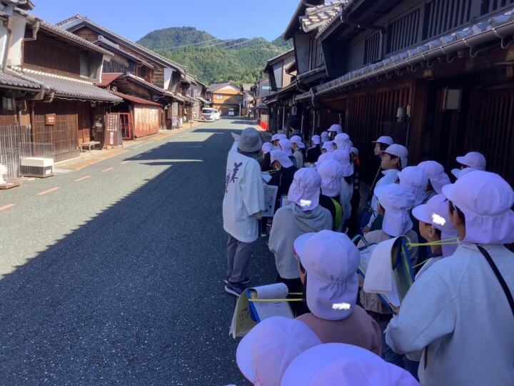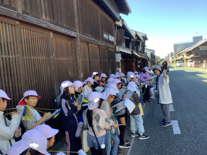 4年生の校外学習です。秋晴れの中、うだつの上がる町並みと美濃和紙の里会館の見学をしました。午前は、美濃市にあるうだつの上がる古い町並みをボランティアガイドさんに案内いただきながら見学しました。江戸時代から続くうだつという防火壁が、その豪華さを競い合うように家々に作られており、それぞれの家にあるうだつや屋根の特徴を見比べながら昔の暮らしぶりを学ぶことができました。熱心にメモを取りながら礼儀正しく学んでおり、ボランティアさんにも褒めていただきました。お昼は、美濃和紙の里会館の芝生広場でお弁当タイム。天気にも恵まれ、屋外で楽しく食べることができました。美味しいお弁当ごちそうさまです!午後は、美濃和紙の里会館で美濃和紙の紙すき体験です。職人が使う本物の道具を使いながら一人一人が楮(こうぞ)100%の本格的紙すきを体験しました。それぞれ自分好みの飾りを紙に挟みこみ、オリジナルの美濃和紙に仕上げていました。美濃和紙の歴史や昔から行われてきた伝統工法を学びながら美濃和紙の栞作りも行いました。すてきな思い出とおみやげができましたね!出来上がりが楽しみです。