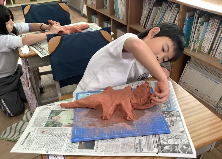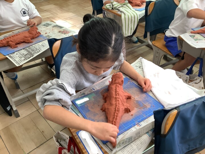 1年生の図工です。今日は、陶芸用のテラコッタ粘土を使ったわに作りです。いつもと違う質感の赤い粘土にわくわくが止まらないようでした。まずは、粘土を一生懸命こね、太い丸太の形にしたあと、頭の部分を型づくり、しっぽを細く尖らせると胴体の完成です。先生に針金でお口を開けてもらうと、お!わにらしくなってきましたね。口を広げ、鋭い牙をつくり、きゅっきゅと粘土を指でつまんで、ゴツゴツとしたうろこができると、立派なわにが完成です。迫力があってかっこいいですね。大満足の仕上がりに、みんな笑顔になっていました。わにづくり大成功!