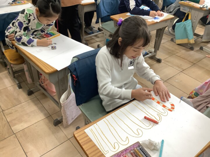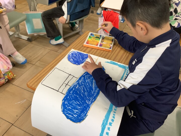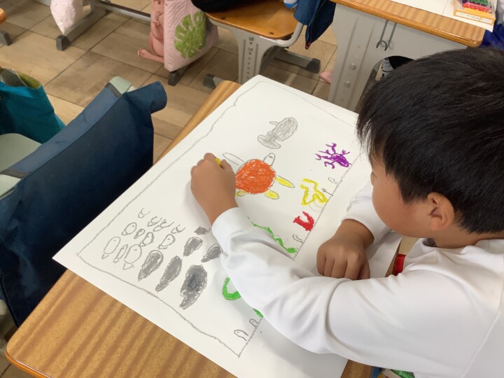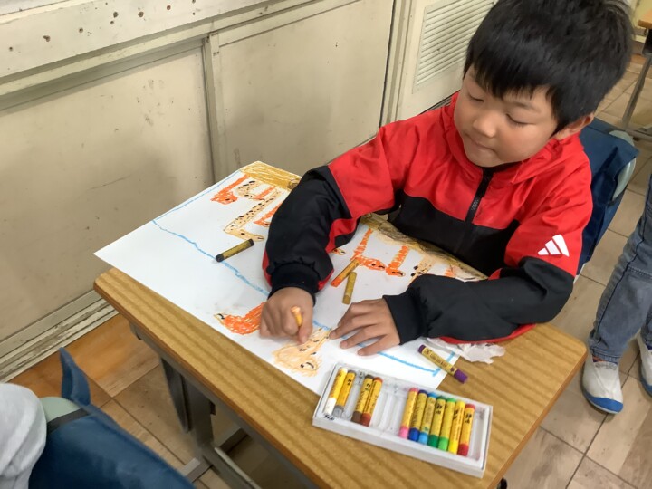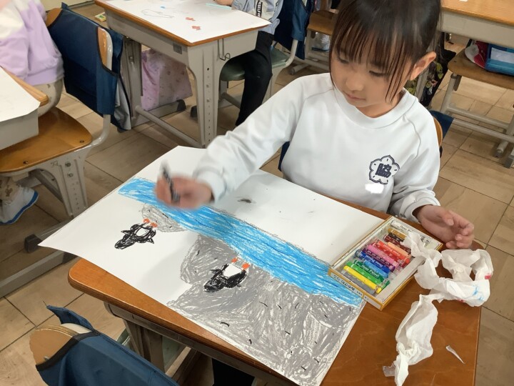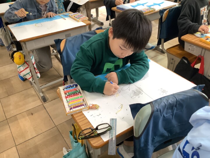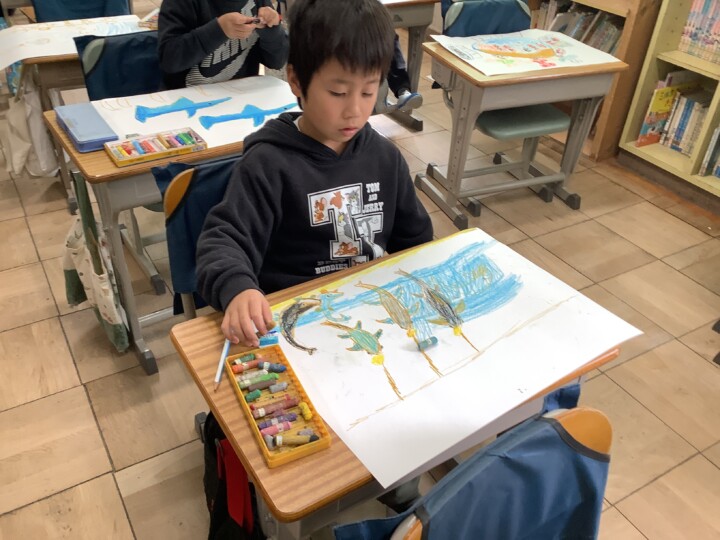 2年生の図工の時間です。先日の校外学習で行った名古屋港水族館での思い出を絵にしていました。さて、どんな思い出があったのでしょうか?「イルカショーでイルカが高く飛んでてすごくかっこよかったんだ!」「ペンギンの親子がかわいかったから書いてみたよ!」「でっかい水そうにね、こんなおっきいっカメがゆらゆら泳いでたんだ。」「みてみて!チンアナゴが砂から、いっぱい顔を出してたんだよ!」とみんな嬉しそうに思い出を語ってくれました。波の模様や魚のヒレなど細かいところまでこだわって書いていました。色鮮やかで、躍動感ある絵からも、海の生き物たちの迫力やみんなの感動が伝わってきました。まるで一緒に水族館に行ったような気分になれました。