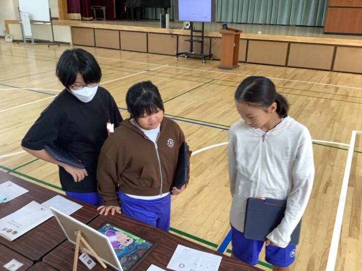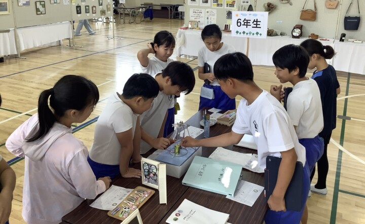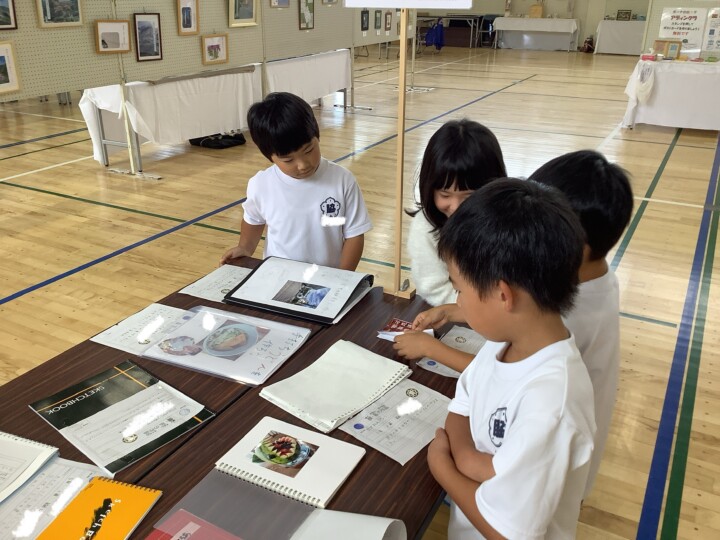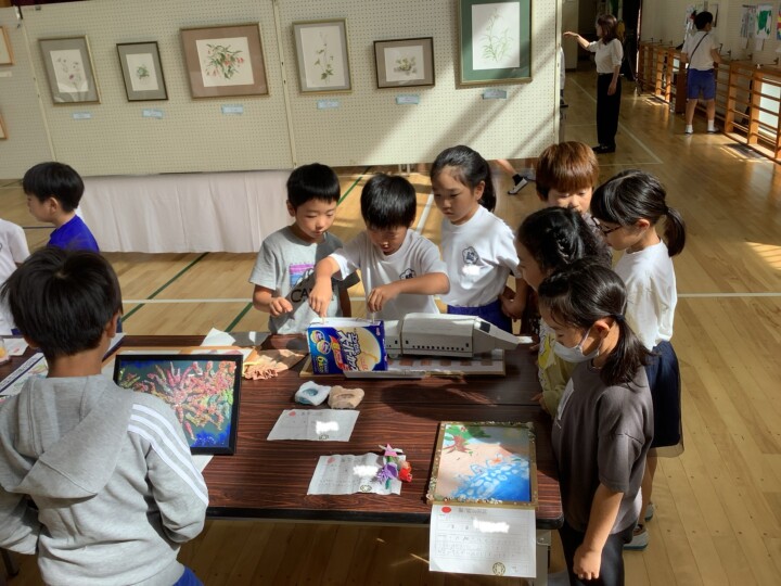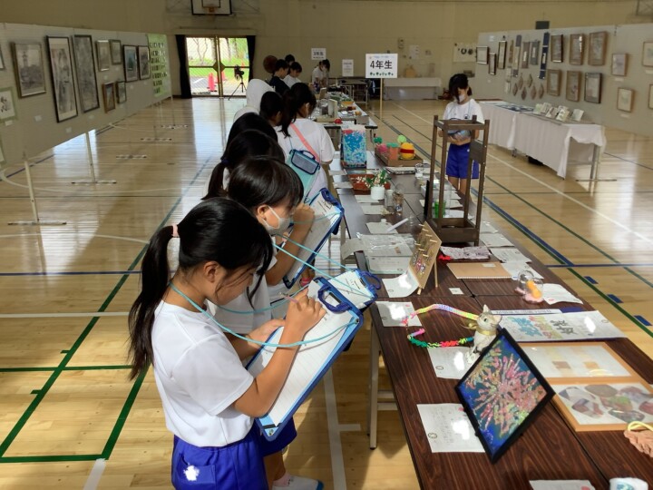 地域の方とみんなの夏休みの作品の合同展覧会がありました。夏休みの大事な一作品の数々が並び、ついつい足を止めてしまいますね。低学年の子達は、お兄さんお姉さんの研究や作品を目の当たりにし、「すごーい!」「こんな風にできるようになるかなあ」と感動していました。また、ミニチュアやマスコット、サンプル、スノードームなどこだわりのつまったかわいらしい作品もたくさんありました。「おもしろいなあ!」「かわいい!わたしもつくりたいなあ。」「すごいね!めっちゃリアル!」と高学年も心くすぐられる作品がたくさんありました。地域の方々の素敵な写真や絵、小物といった作品には見とれていました。ご協力いただきありがとうございました。