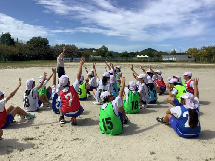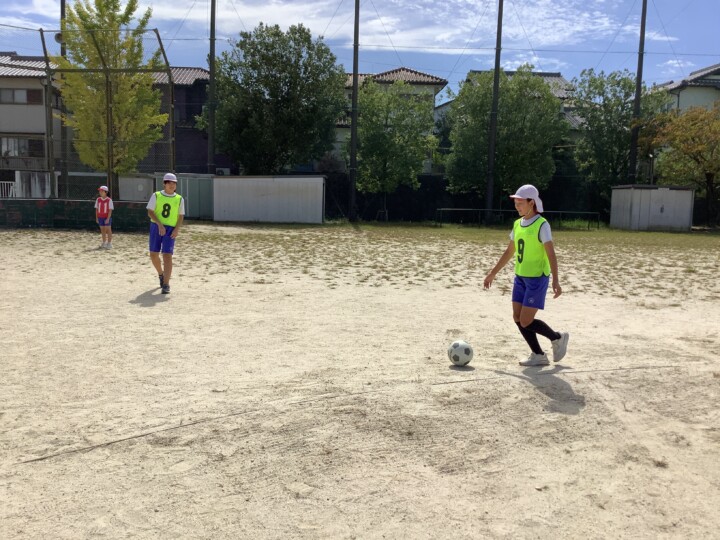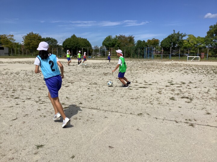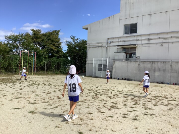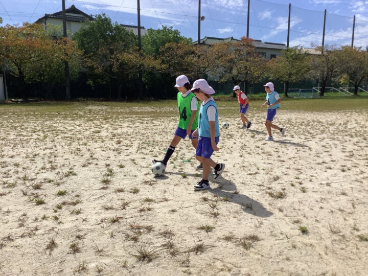 6年生の体育、サッカーです。ペアでボールパスの練習をしていました。走りながらのボールのコントロールは難関ですね、仲間をすり抜けてポンポンと飛んでいってしまいます。そこで、一度集合し、まずはパスが上手になるために3つ大切なことをみんなで確認しました。ボールと仲間をしっかりみること、ボールを蹴る強さを考えること、仲間の名前を呼んでパスをすることでした。その後チームに分かれて、相手にちょうど良い強さで届くように蹴り方の練習、掛け声をだしながら元気よく時間いっぱいパス練習をしていました。だんだんと、スムーズなパスがだせていました。ボールも気持ちも繋がってきたのではないでしょうか。