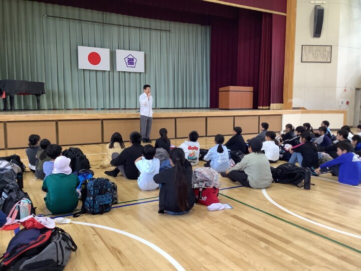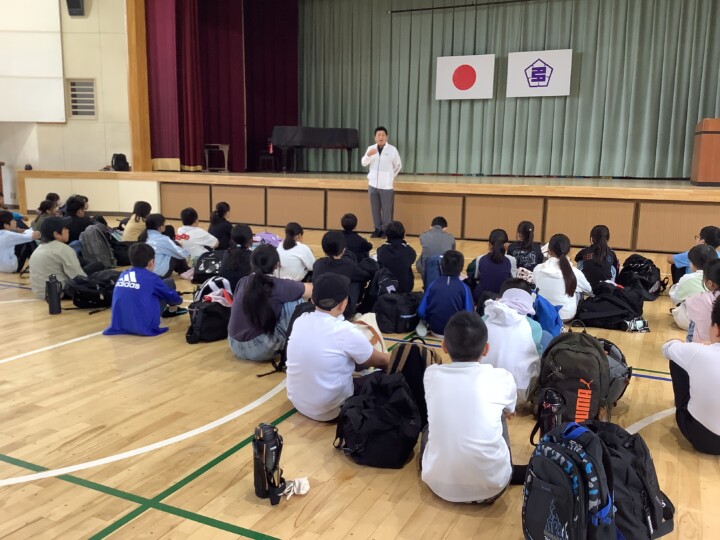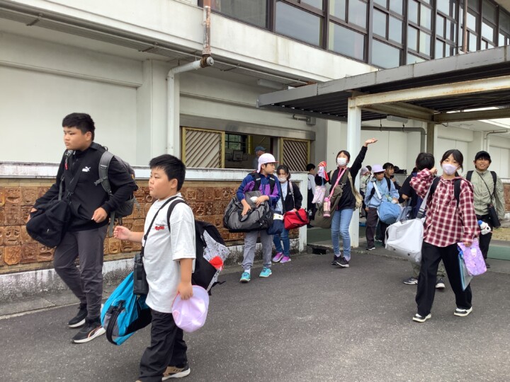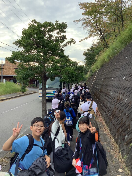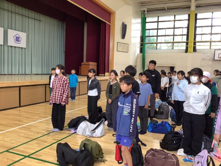 おはようございます☀天気に恵まれ、全員元気に宿泊研修スタートしました。朝の出発式の様子です。校長先生のお話にあったように、学校では学べないことを五感を活用してたくさん感じて、体験しましょう!また、活動を通して、新たな仲間の良さや一面を発見できる、すてきな宿泊研修にしましょう!お見送りの先生や脇っ子に見守られながら、元気に行ってきまーす!