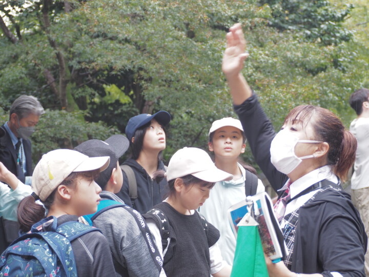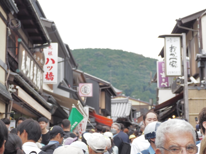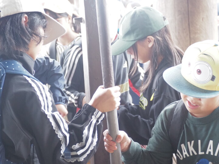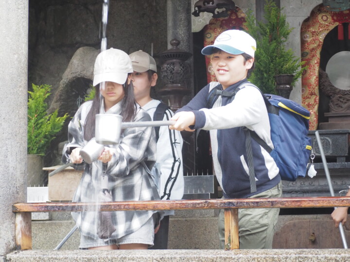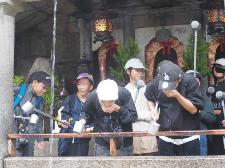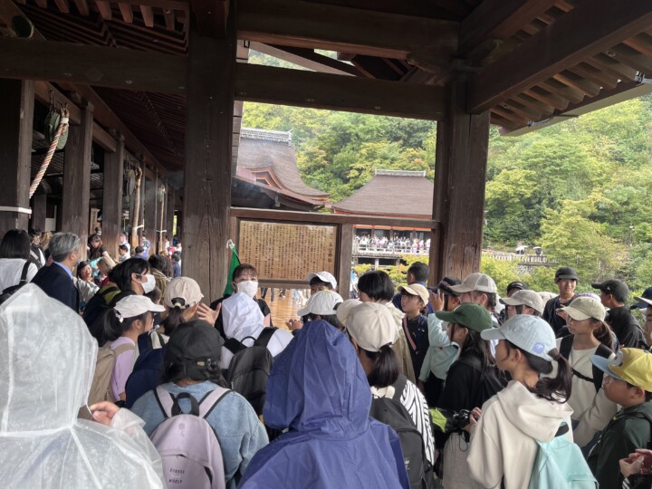 京都に到着し、1日目最初は、清水寺の見学です。気合を入れ、坂と階段をどんどん上ると、清水の舞台に つきました。少し色づいてきた山々や遠くに見える建物、人、雨の中ですが、京都の町並みなどが一望でき、まさに苦労吹き飛ぶ絶景です。「きれい、!」「わーーすごい!」と歓声があがりました。下駄と錫杖はなかなかの重さがあるようで、苦戦するも、さすがの根性ですね!顔を真っ赤にしながら持ち上げていました。