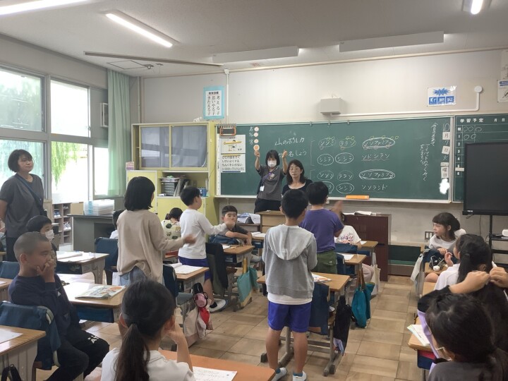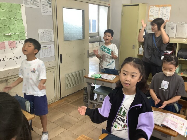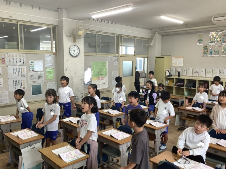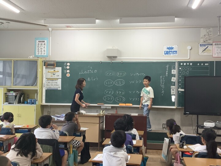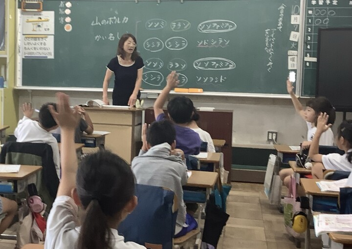 2年生の音楽「山のポルカ」という愉快な曲です。まずは、ドレミファソラシドのかい名でフレーズの仲間探しをしました。すると「わあ、3つも、一緒なんだね!」「ちょっと似てるところがあるよ。」と曲の特徴に気づいたようです。その後、音楽に合わせて歌ってみました。リズムに乗って揺れながら楽しく、前から見てもよくわかる大きなお口が素敵です!タン・ウン、タン・ウン、タンタンタン、ウン・タンタン、ウン・タンタンの2つのリズムを習いました。「あれ?」「できないなあ、」と首をかしげる様子。拍を感じて手拍子をするのはなかなか難しいようですね。しかし、みんなであきらめず、繰り返し練習、練習!最後には緊張しながらもグループでみんなの前で発表することができました。
