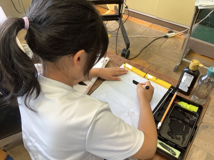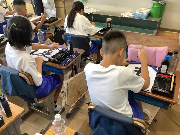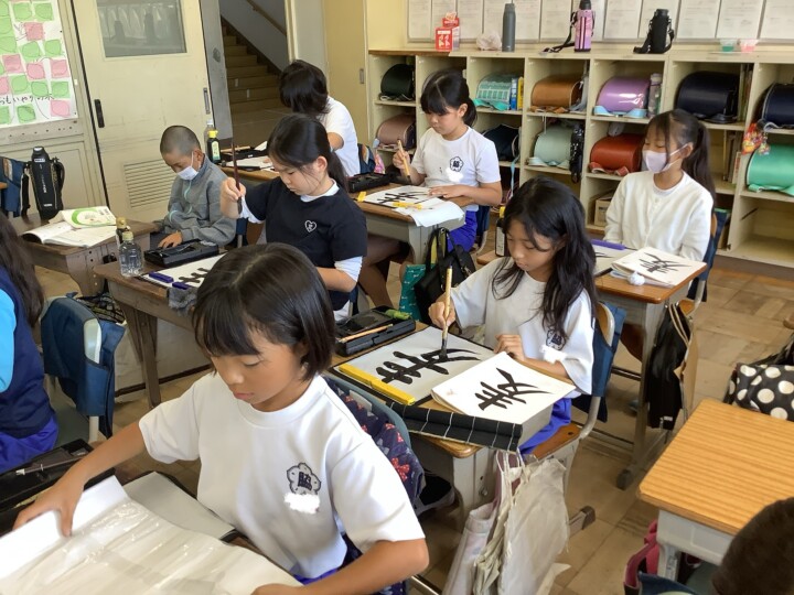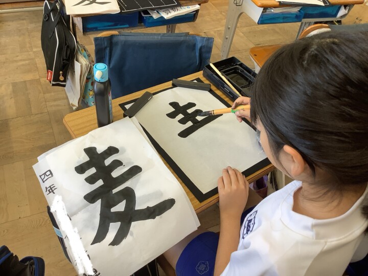 4年生の書写です。今日の一文字は「麦」です。まずは書き方のポイントの説明を聞きました。主に3つ、右上がりに止めること、横3本の長さのバランスを考えること、そして、はらいの長さをそろえることでした。「もっと上手になるにはどうしたらいいかな?」「はい!先生!みてください。」「はらいの書き方を教えてください。」と積極的に挙手してアドバイスをもらっていました。その後も、納得の一枚が仕上がるまで、2枚、3枚と筆を置く手を止めることなく黙々と半紙に向かっていました。清書に向けてがんばっていきます。