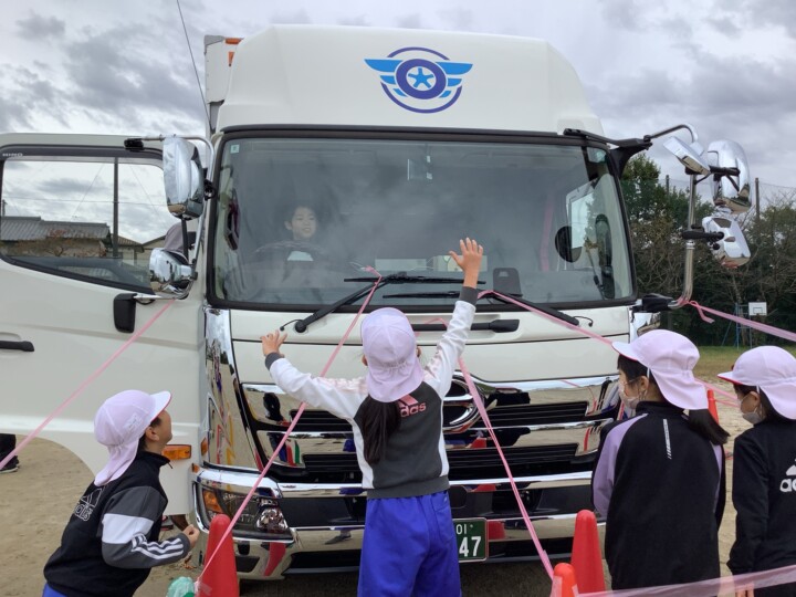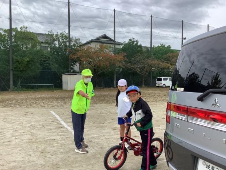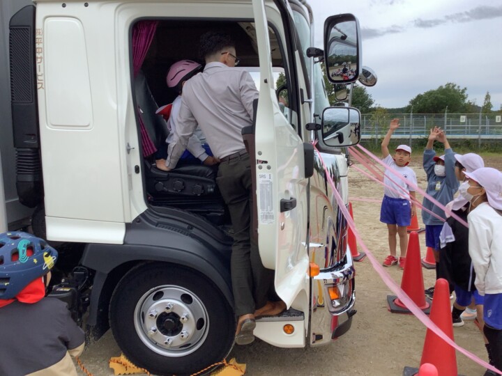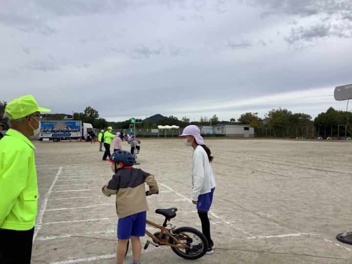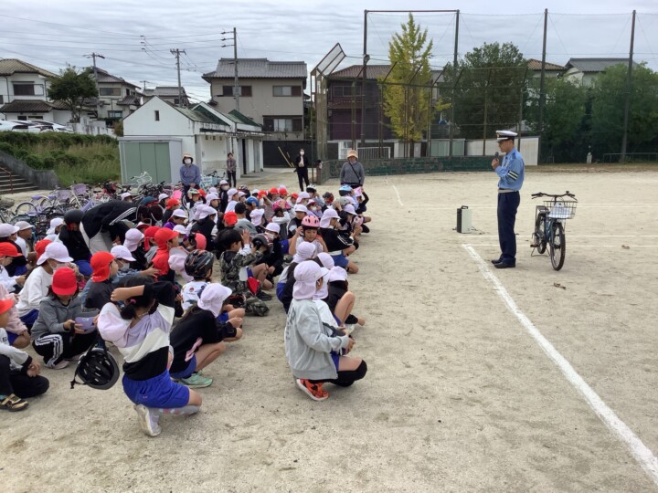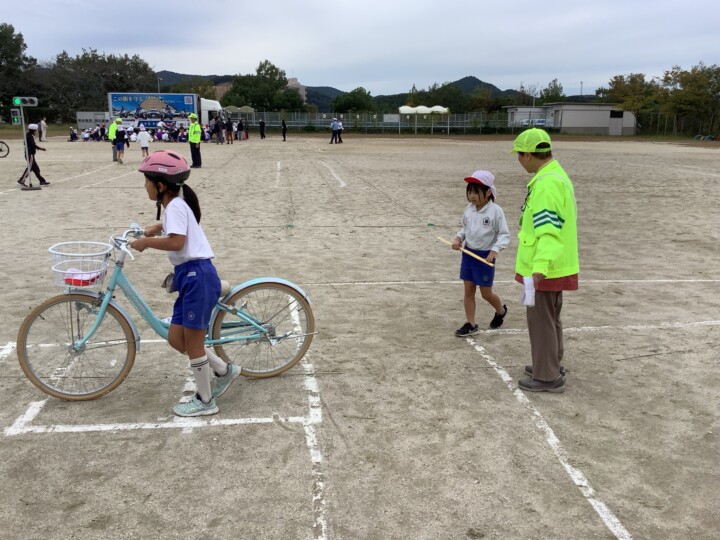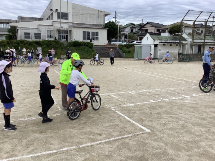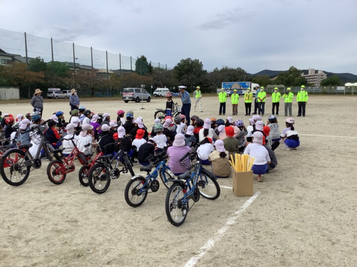 警察官の方、交通安全の地域の方々、保護者の方々の協力のもと、自転車教室を行いました。2.3年生、4年生も2年生のサポートで来てくれました!まずはヘルメットの被り方の確認です。耳を通して、しっかりアゴの下で固定し、ズレないようにしましょう。次に、歩道、交差点での実践です。自転車に乗っていなくても、右左を確認し、自転車を押す仕草をしてイメージトレーニングしていました。横断歩道や信号で立ち止まり、安全確認ばっちり!見通しの悪い交差点では、ペアで慎重に確認して、わたることができました。安全運転のドライバーになれそうでしょうか?また、今回はトラック乗車体験をしました。「あれー?みんないないなあ!」とテープの中が死角になると、実感していました。道路で安全に行動がとれるように、思い出してくださいね!