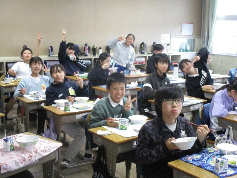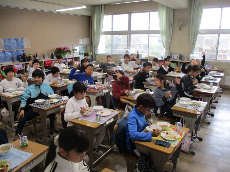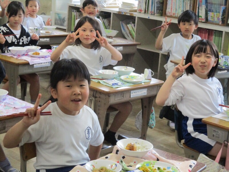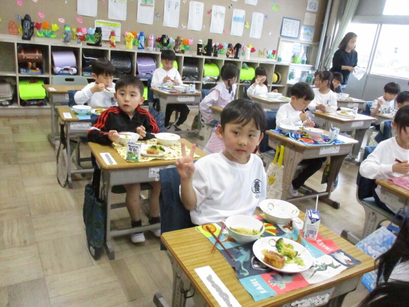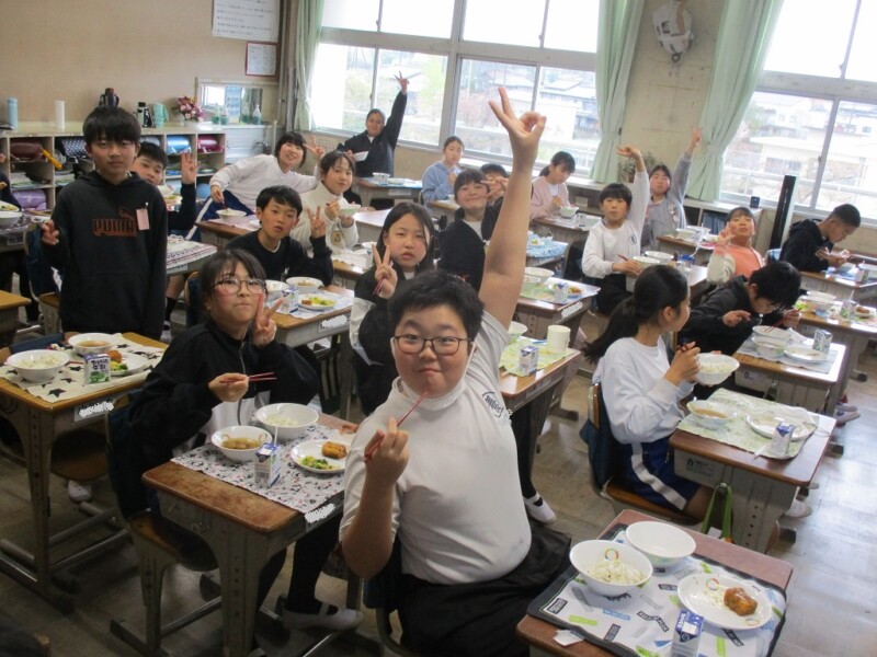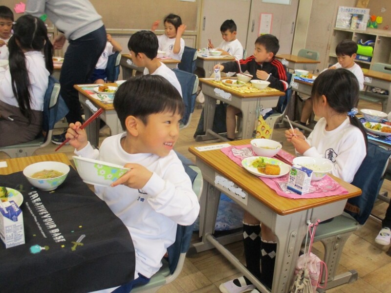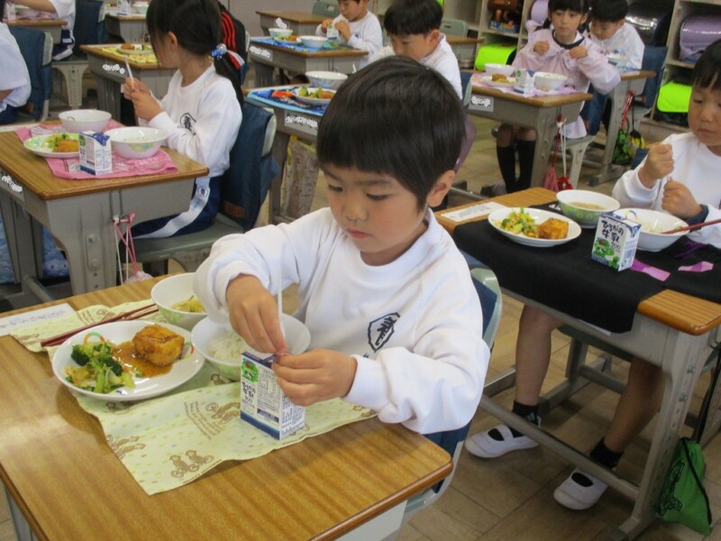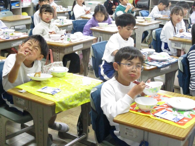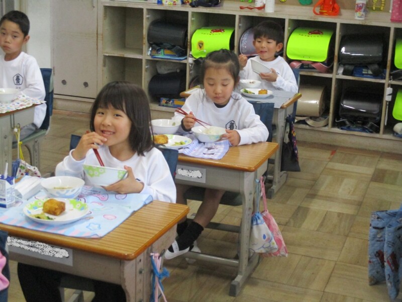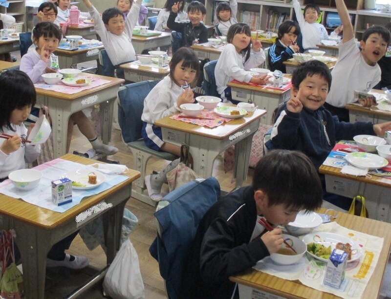 本校の給食は自校給食。学校内に調理場があります。だから、10時くらいから学校中にいい匂いが(*^_^*) そして、ホカホカの給食(^-^)